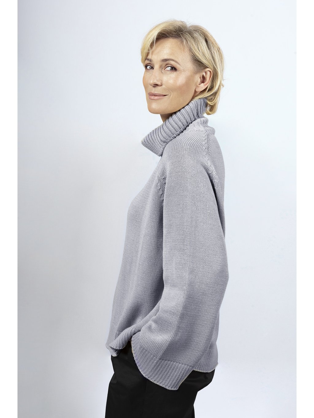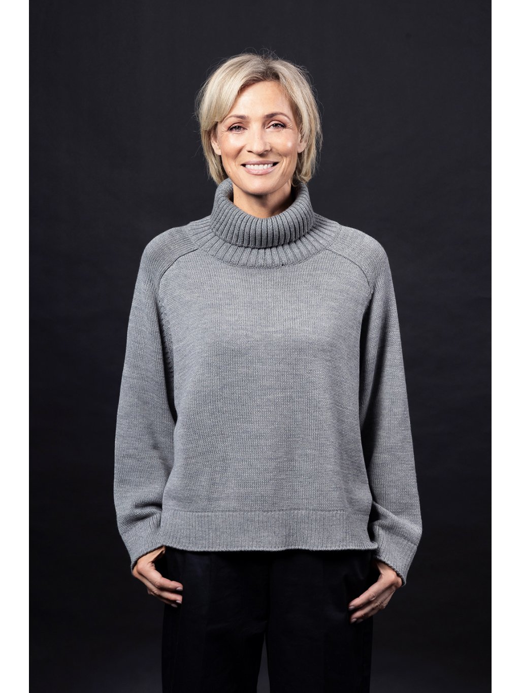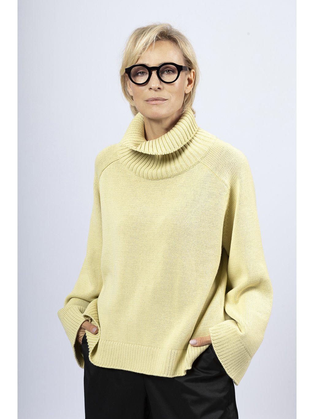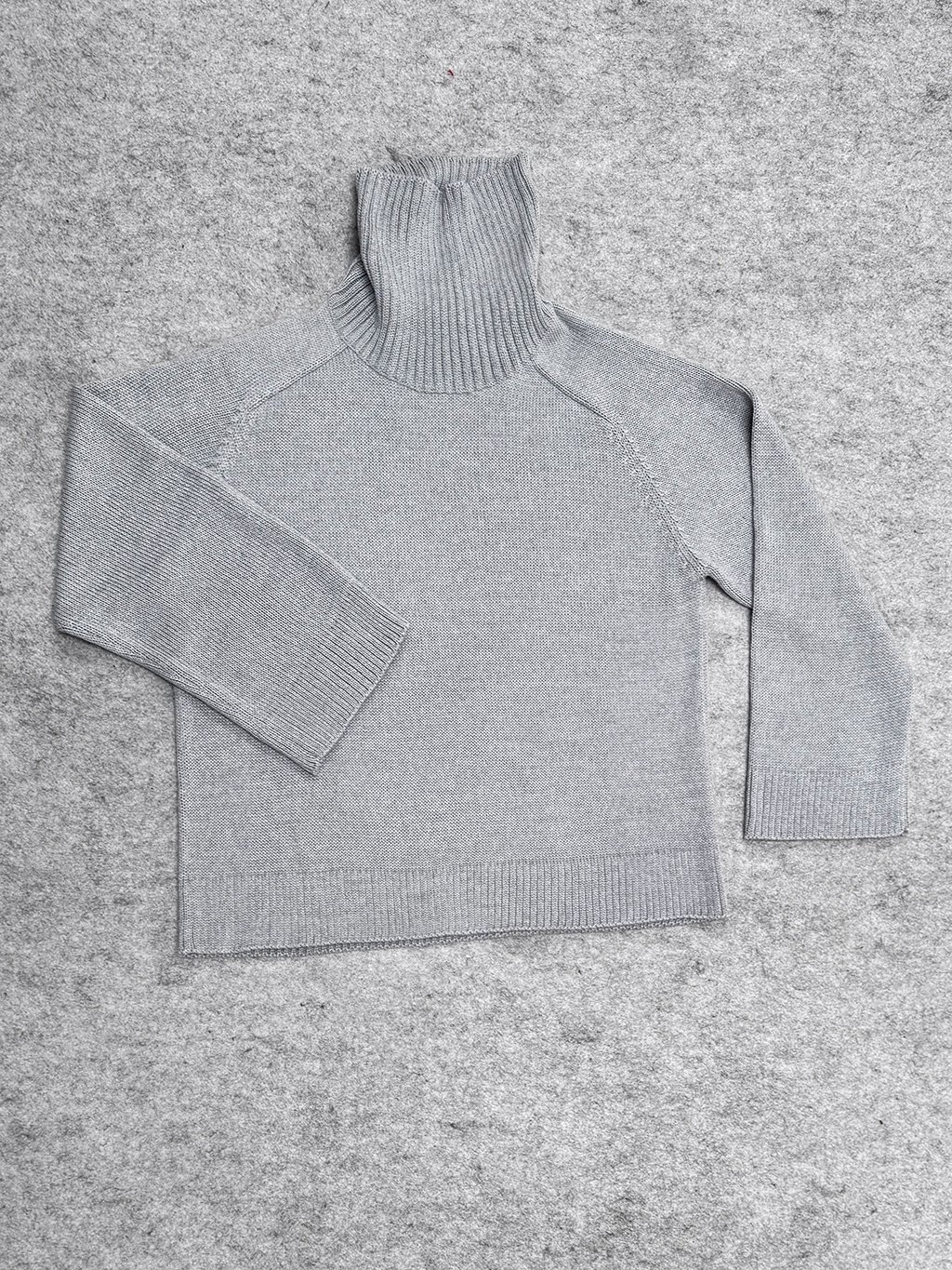 Teplejší svetr s rolákem má raglánový střih a vysoký patent v délce i u rukávu.