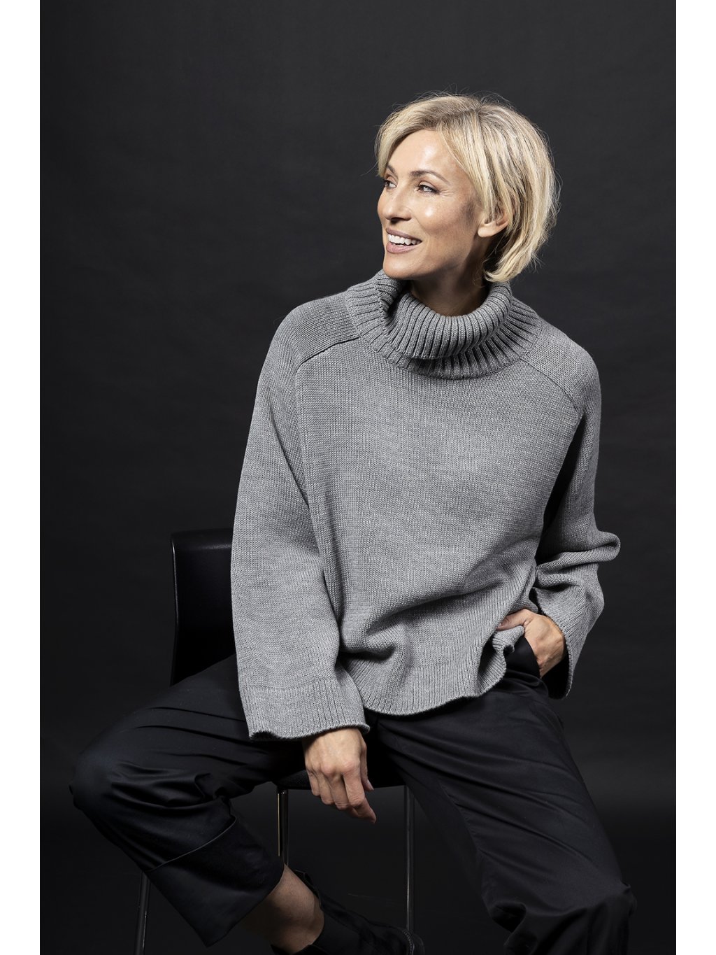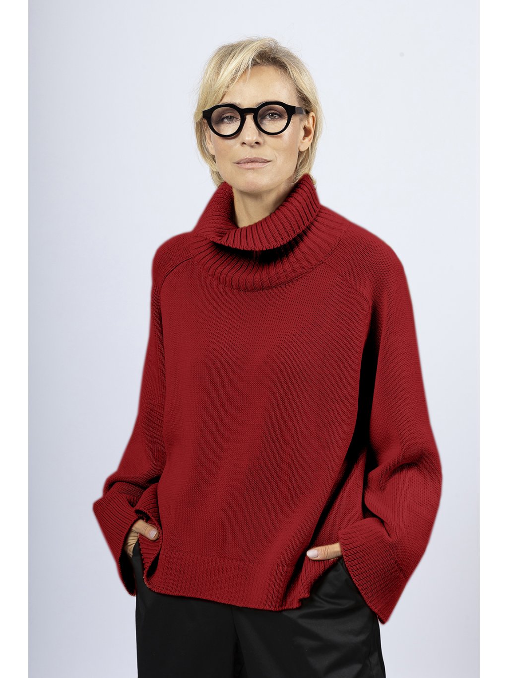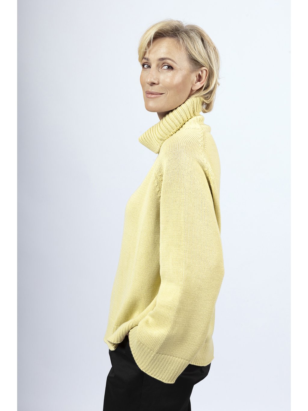 Teplejší svetr s rolákem má raglánový střih a vysoký patent v délce i u rukávu.
