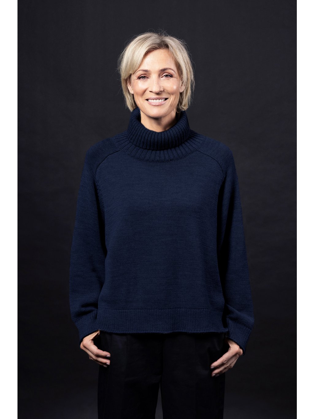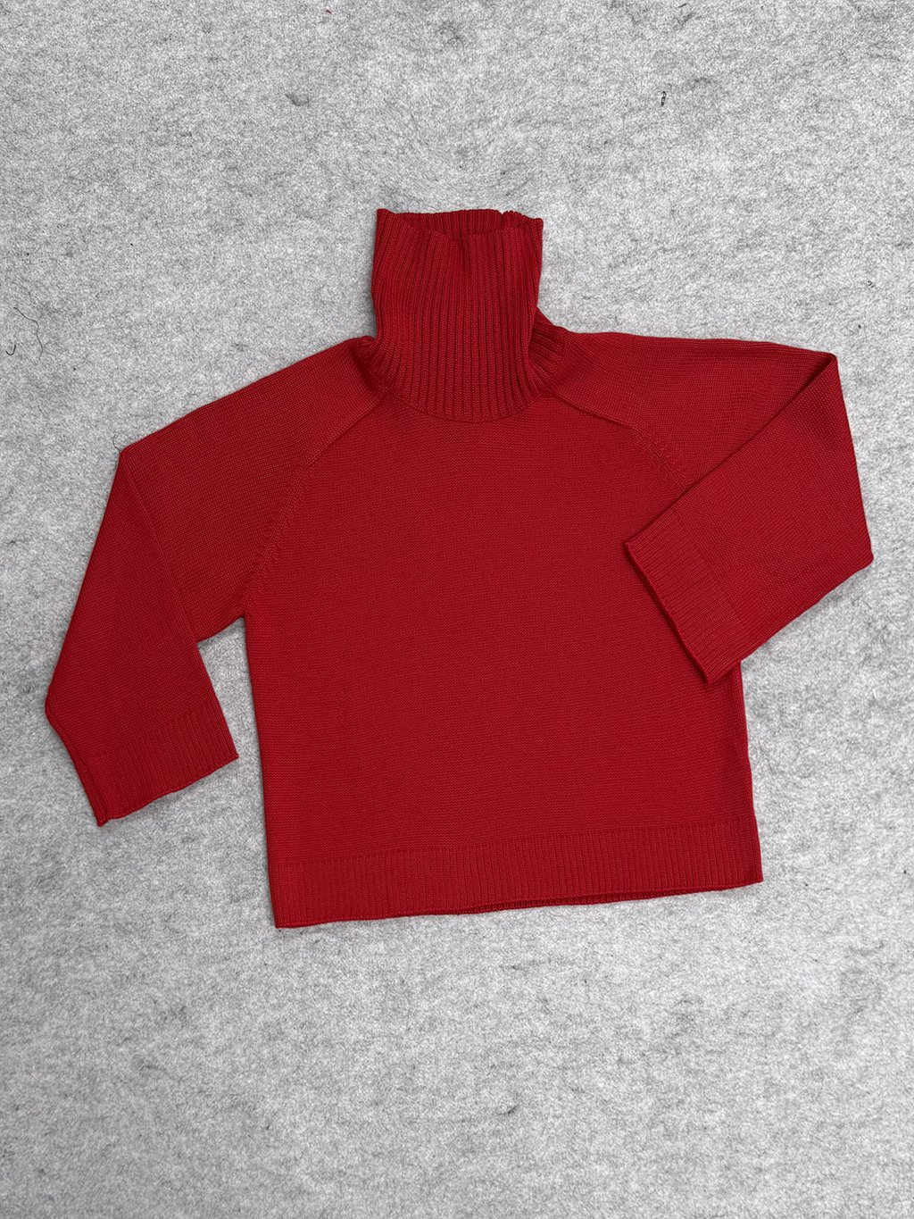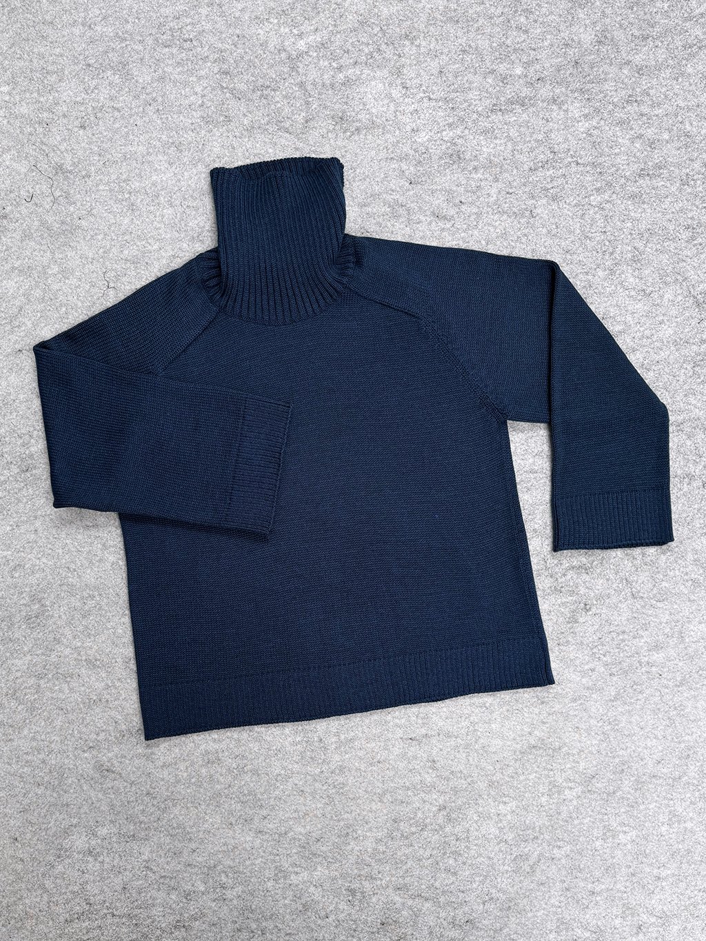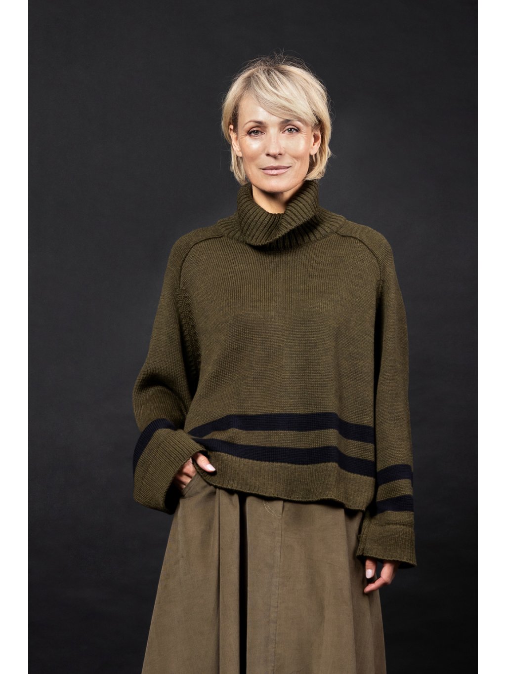 Teplejší svetr s rolákem má raglánový střih a vysoký patent v délce i u rukávu.