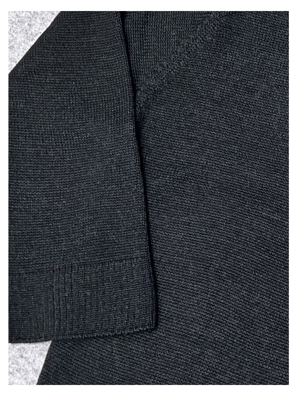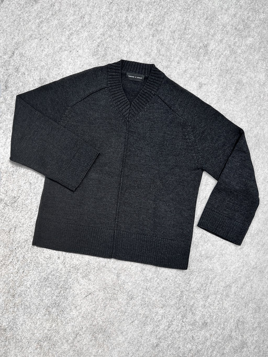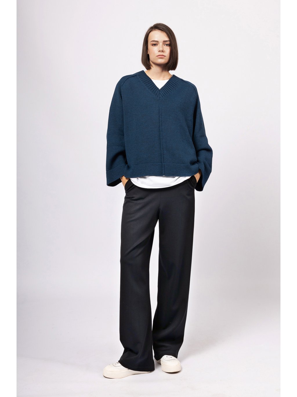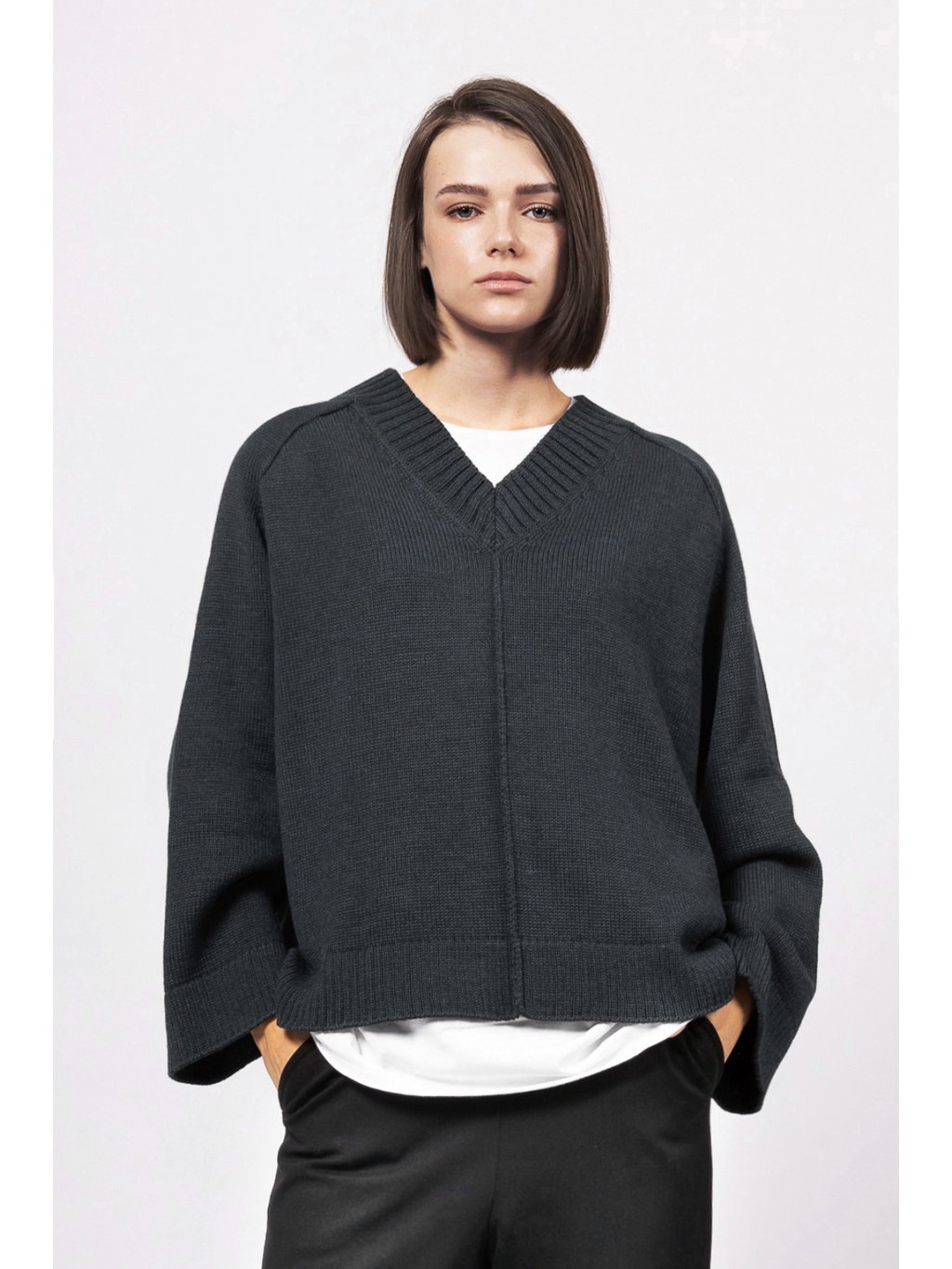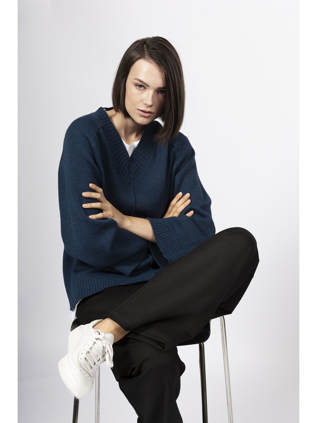 Svetr s véčkem má raglánový střih a vysoký patent v délce i u rukávu.