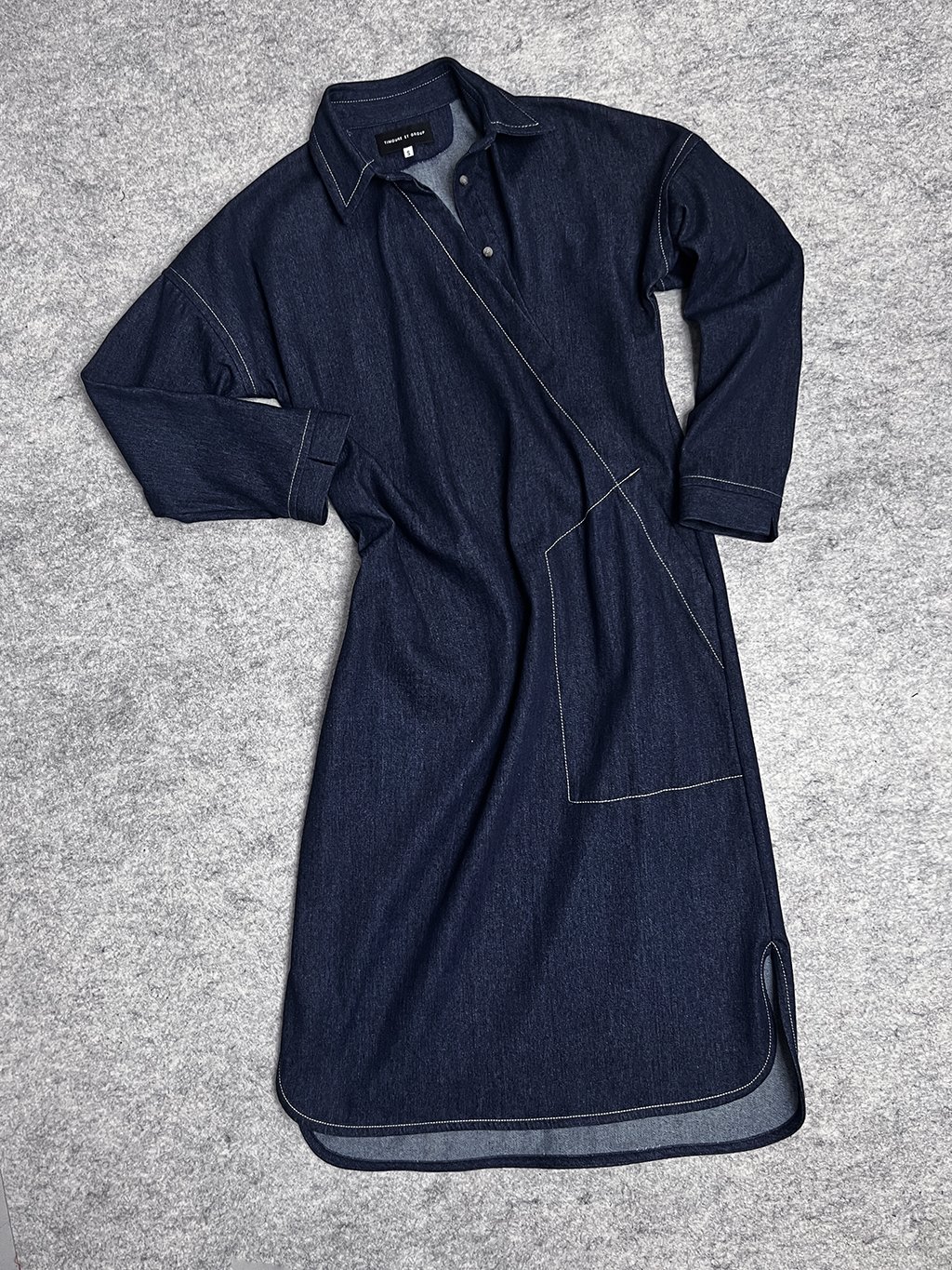 Košilové šaty kimonového střihu mají netradičně šikmou légu, jednu asymetrickou kapsu a tvarovanou délku s rozparkem.
