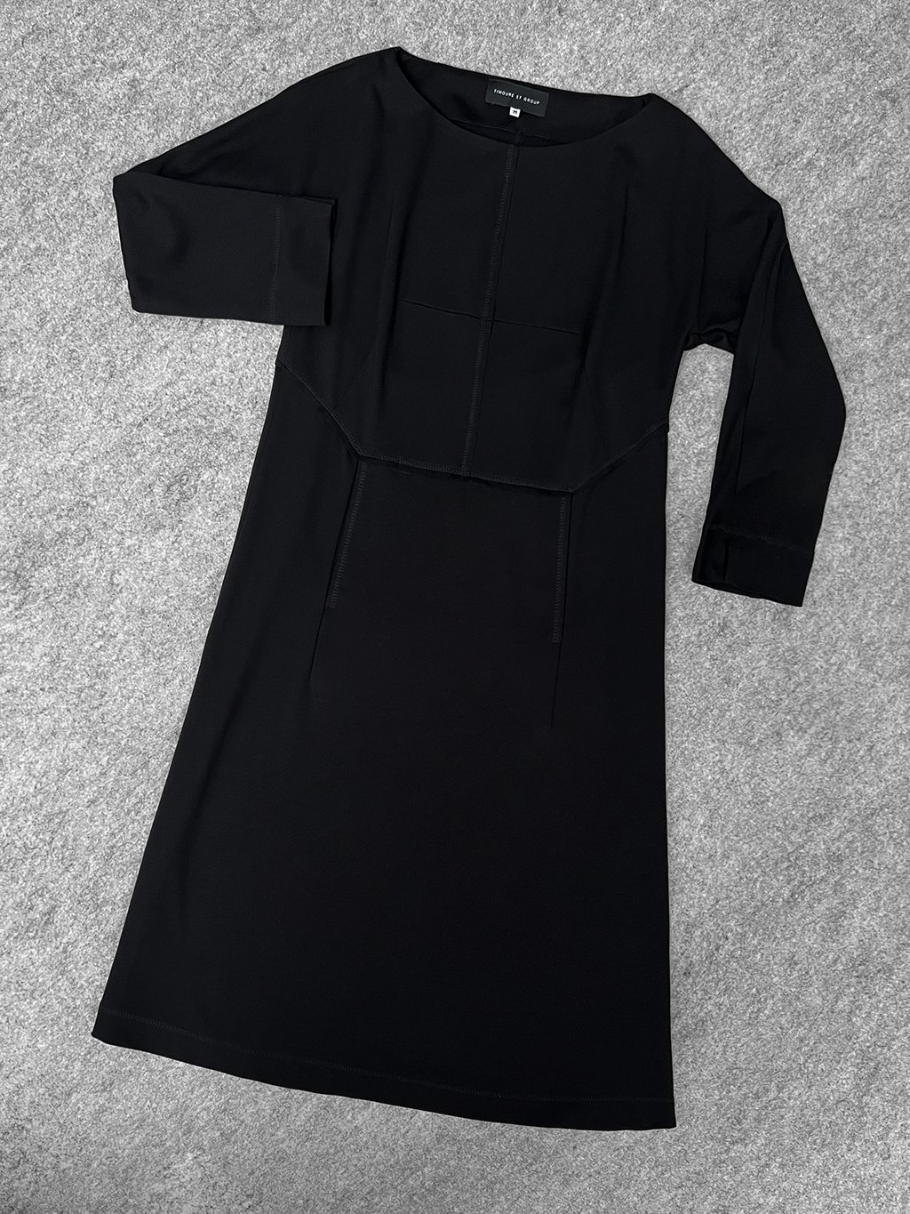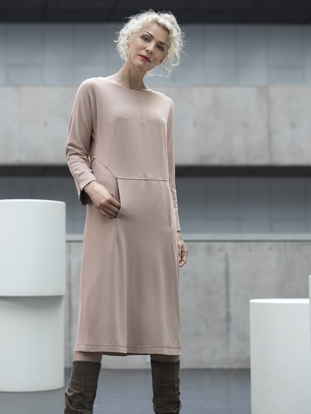 Rovné úpletové šaty mají členící švy na předním dílu na ostro, prošité ozdobným štepem.