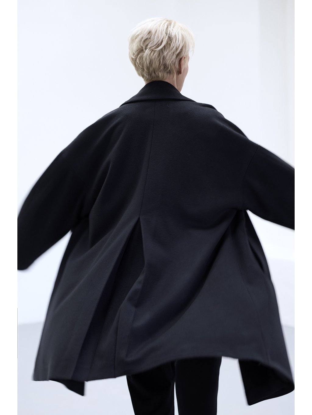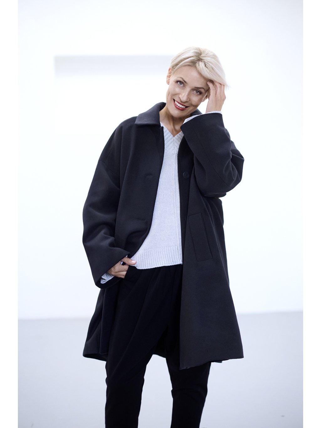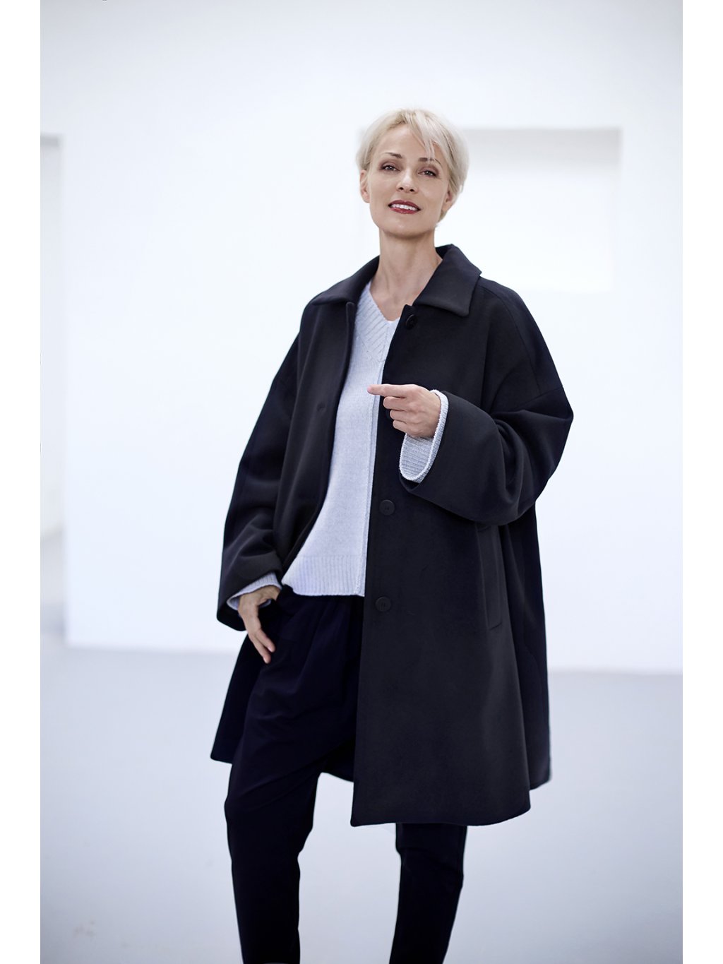 Rozšířený tříčtvrteční kabát s límcem má spadlé rameno a širší rukáv s možností ohrnutí.