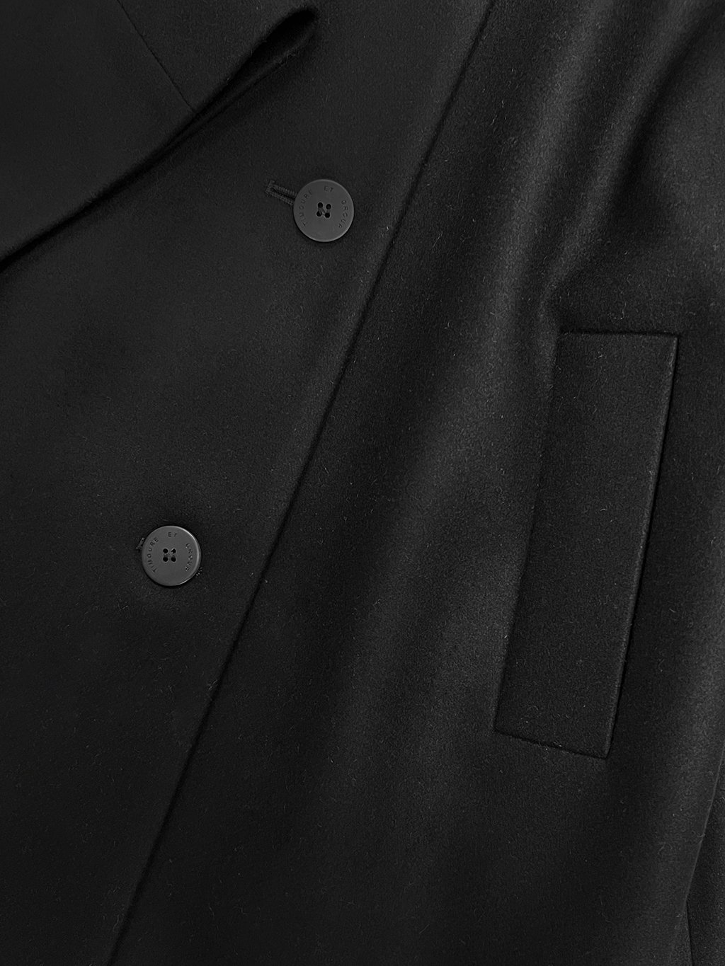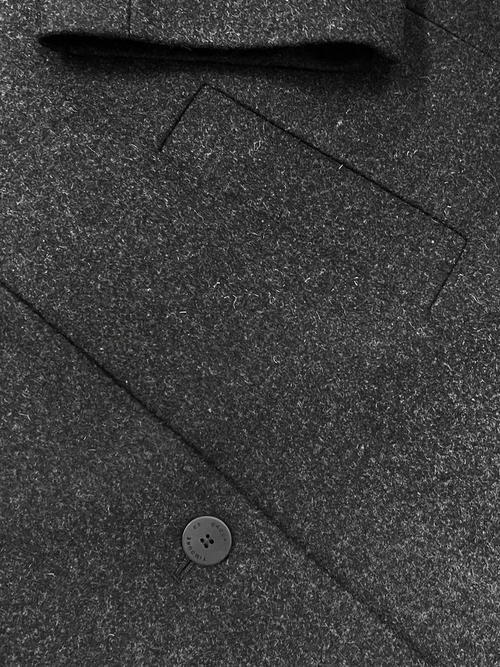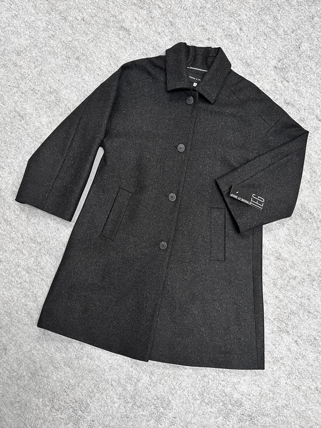 Rozšířený tříčtvrteční kabát s límcem má spadlé rameno a širší rukáv s možností ohrnutí.