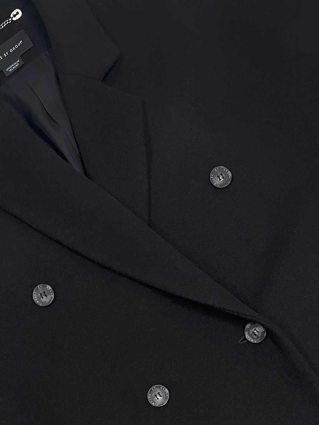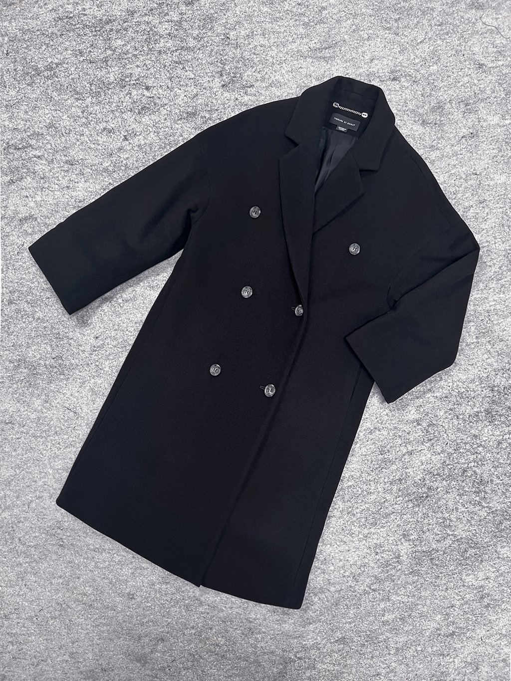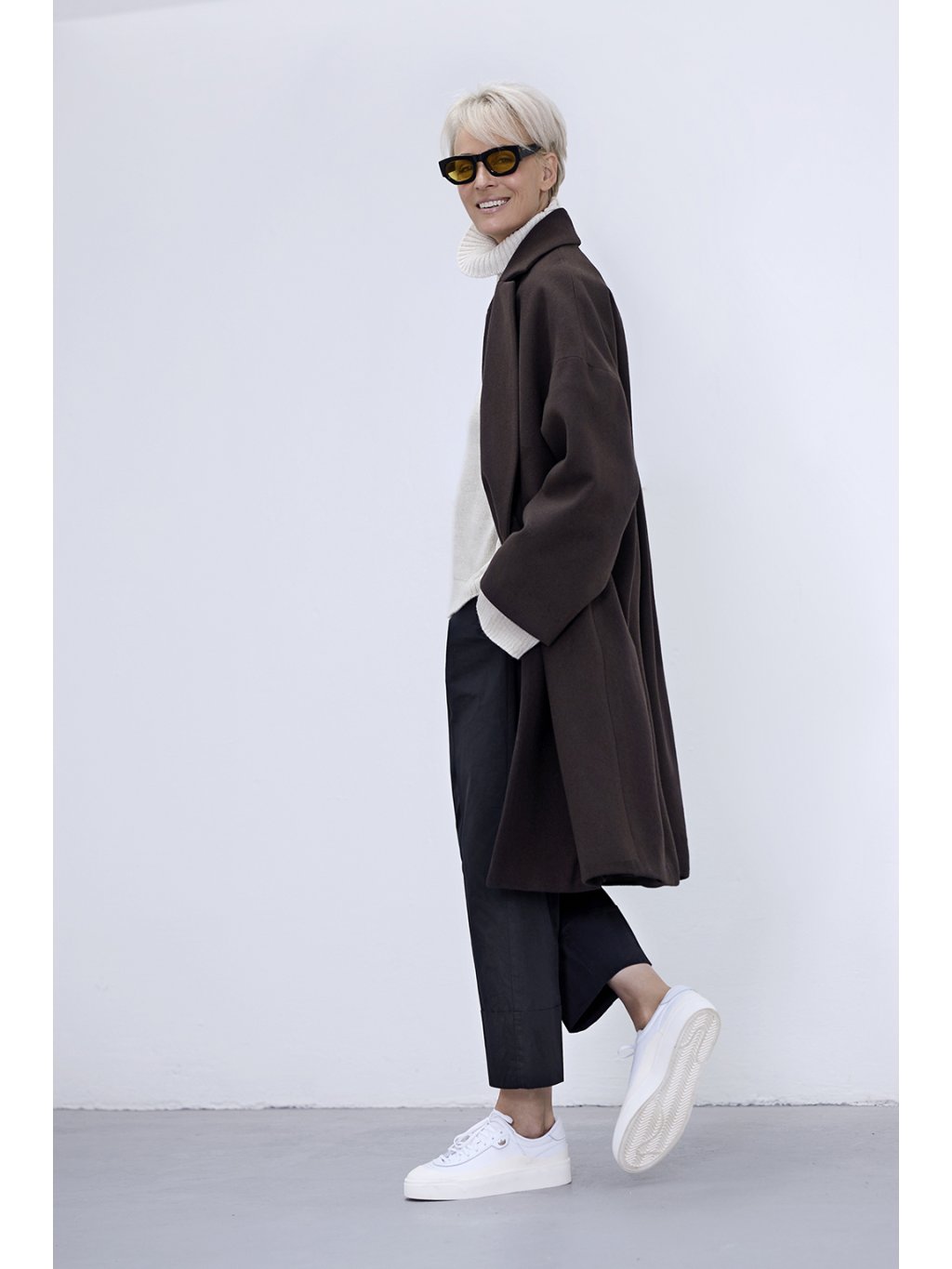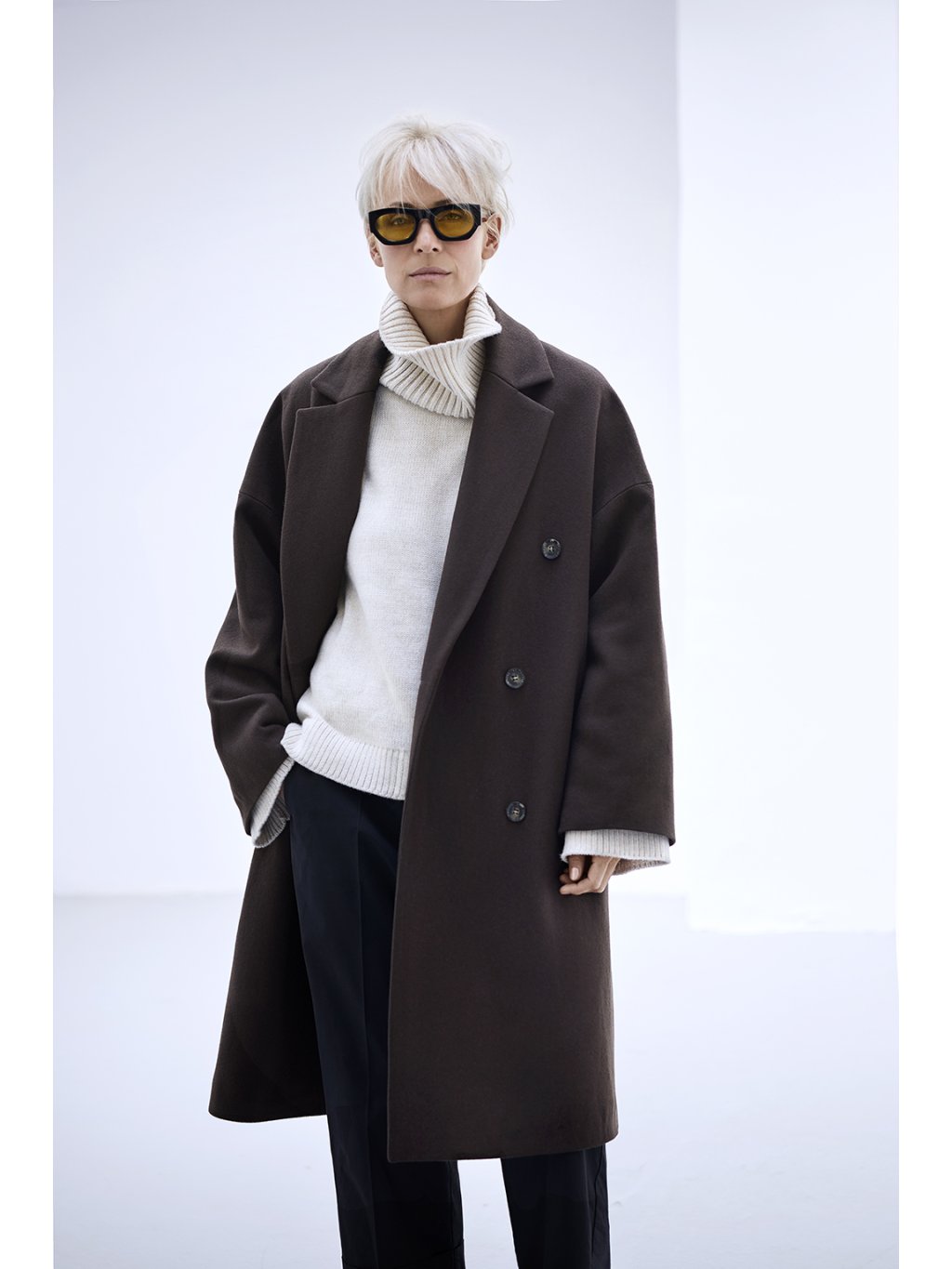 Dvouřadový volný kabát s výraznou fazonou má spadlé rameno a široký rukáv.