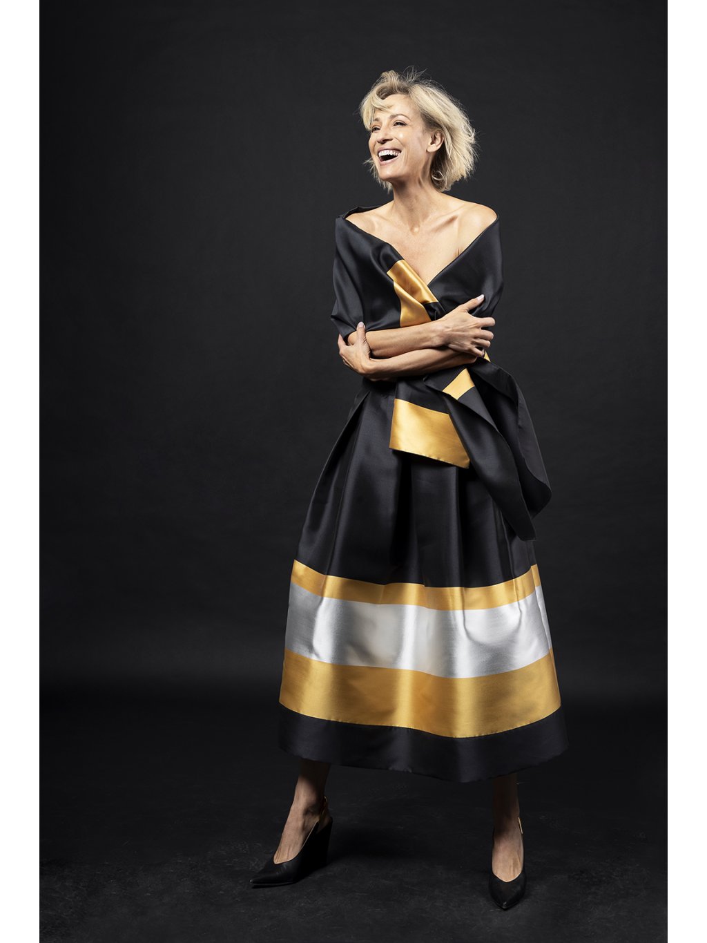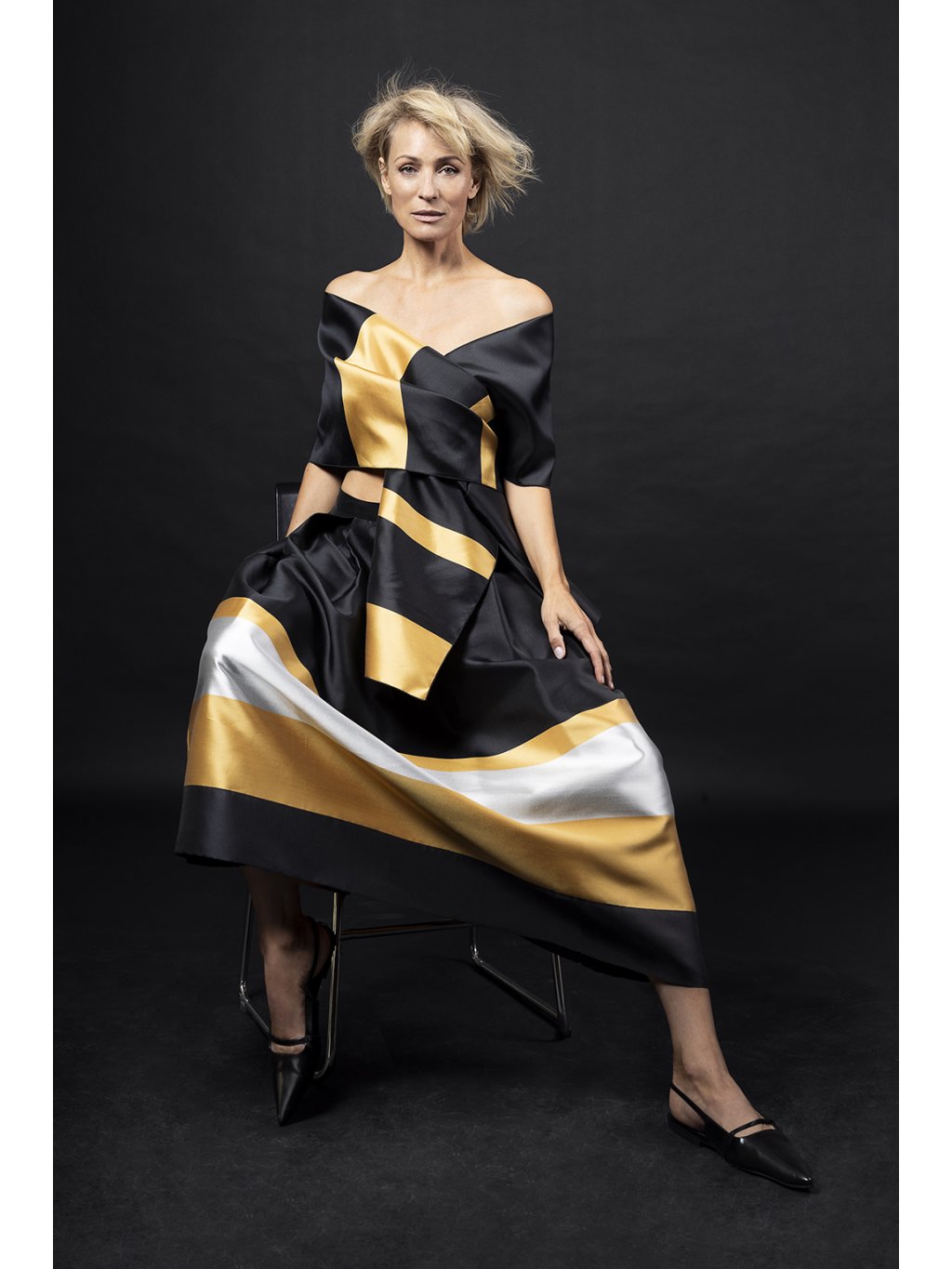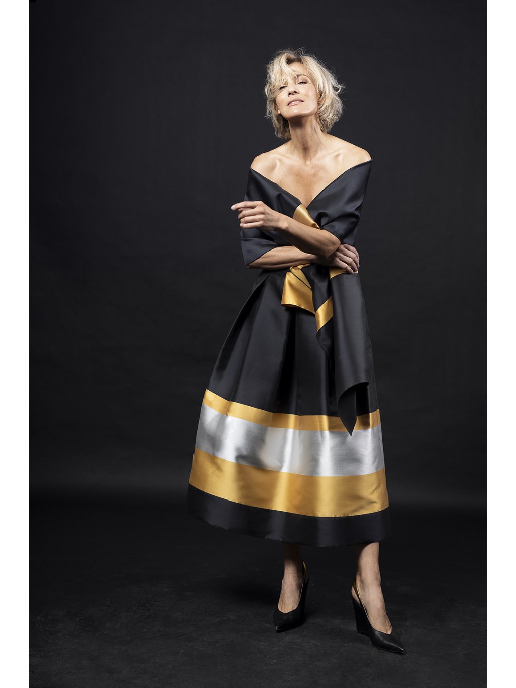 Sukně se sklady bez podšívky má kapsy ve stranním švu a je z několika mimořádných materiálů.
