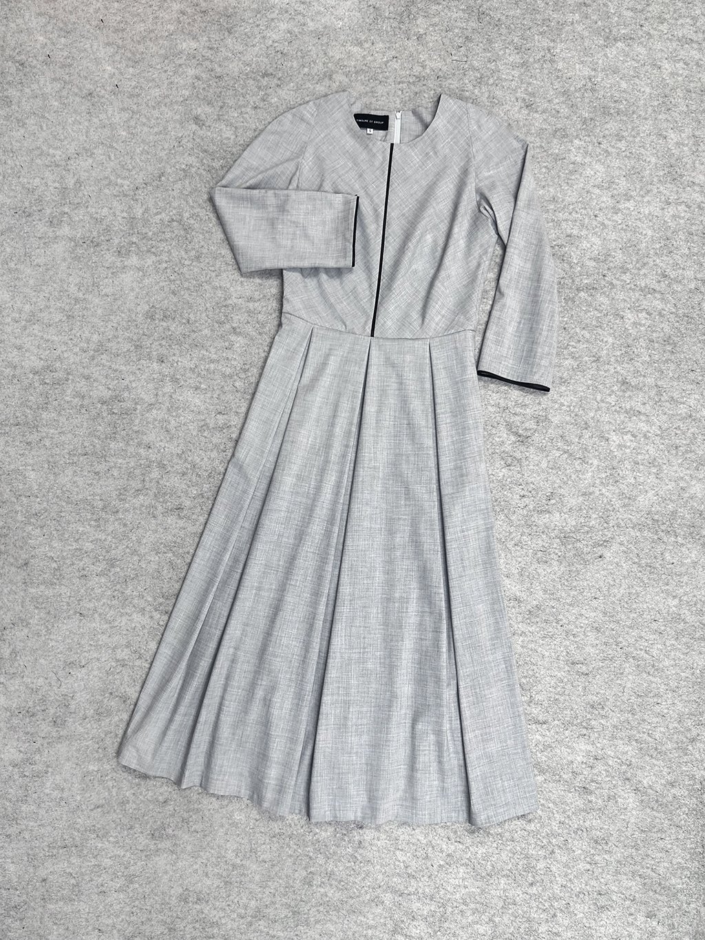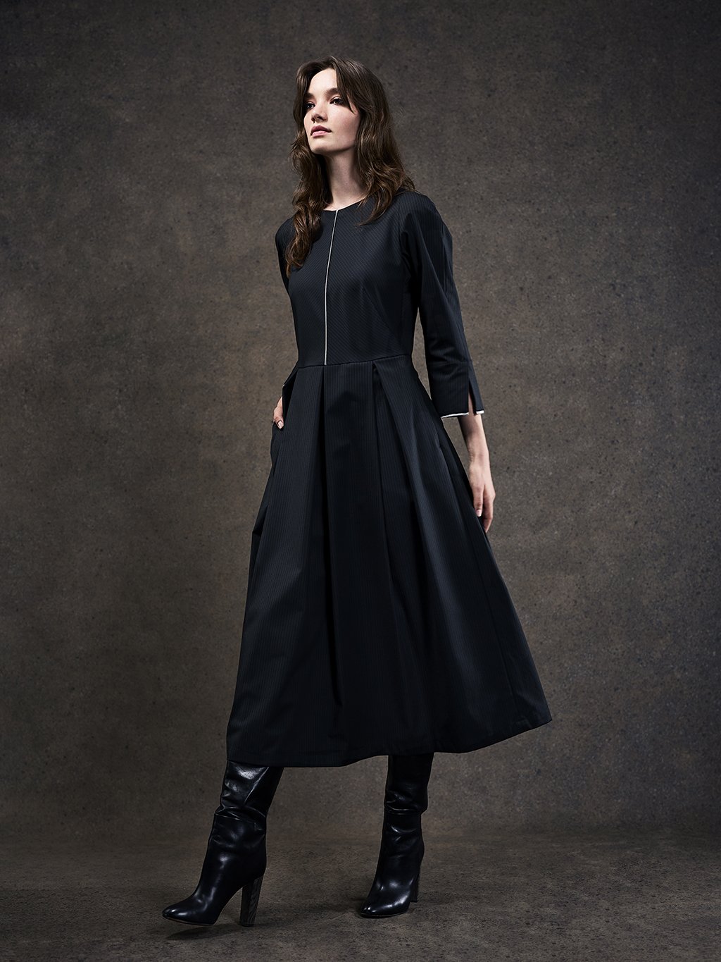 Šaty s hlubšími protizáhyby na sukni mají kulatý výstřih ke krku a štíhlý živůtek.