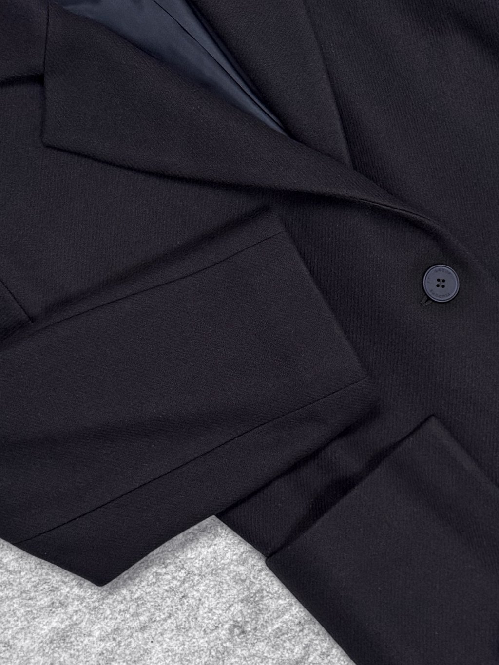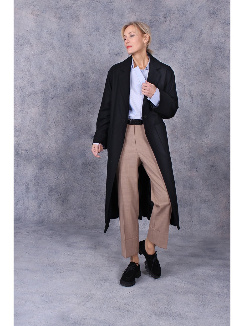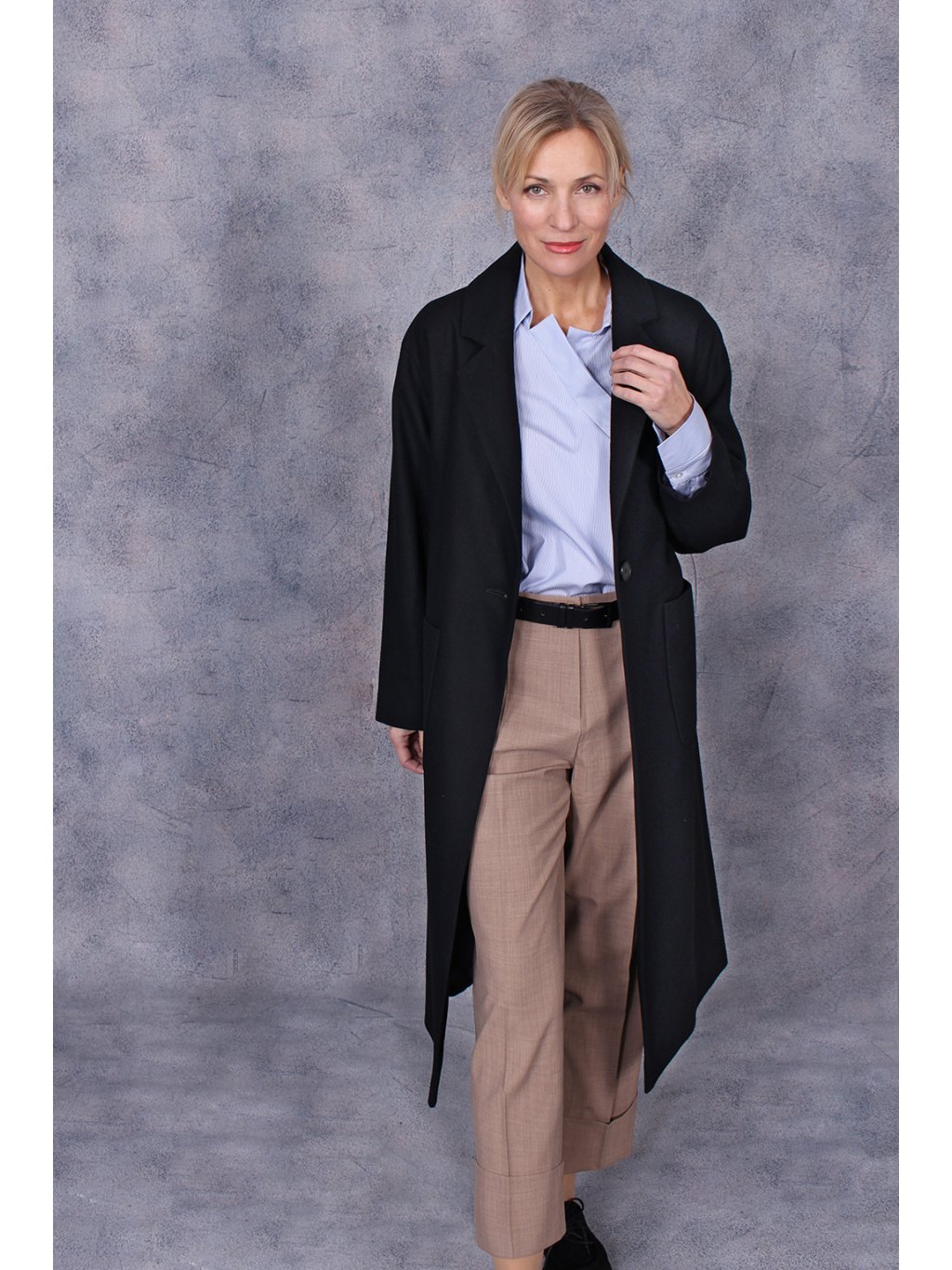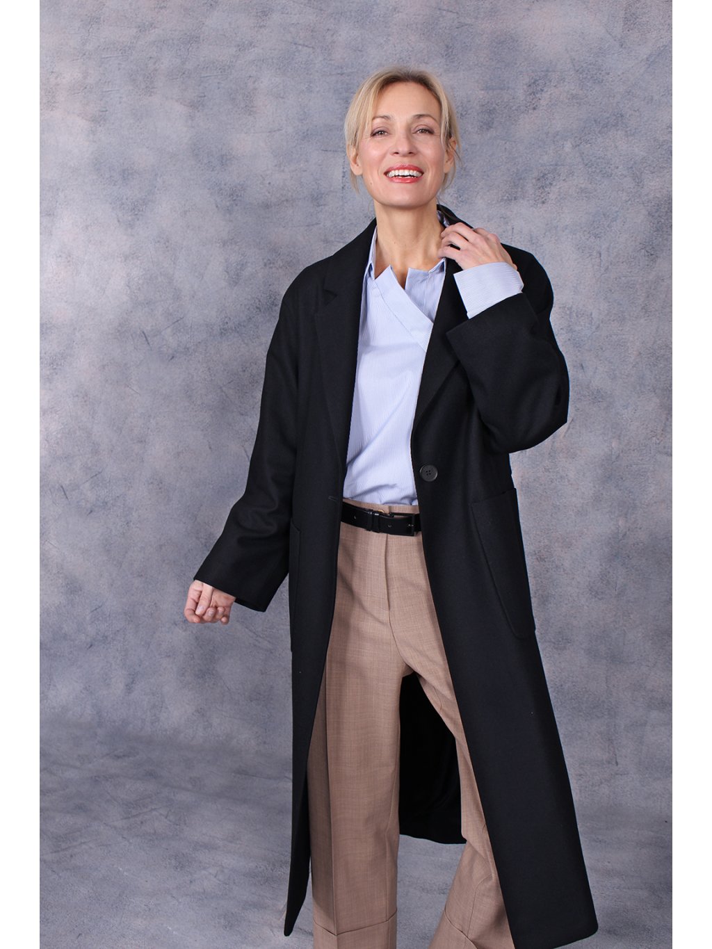 Delší kabát s klasickou fazonou má ideálně vyřešený střih, je zapnutý na jeden knoflík.