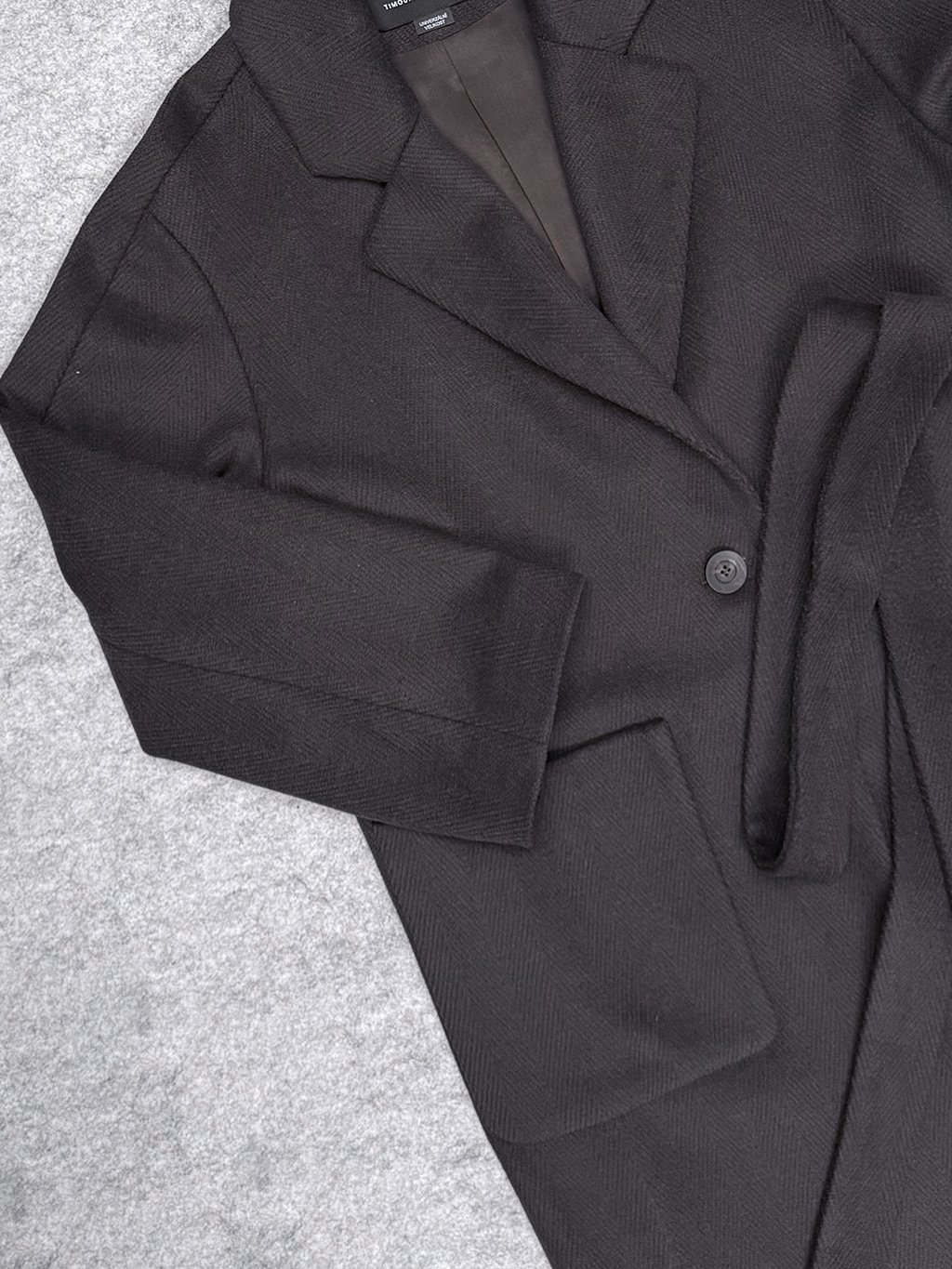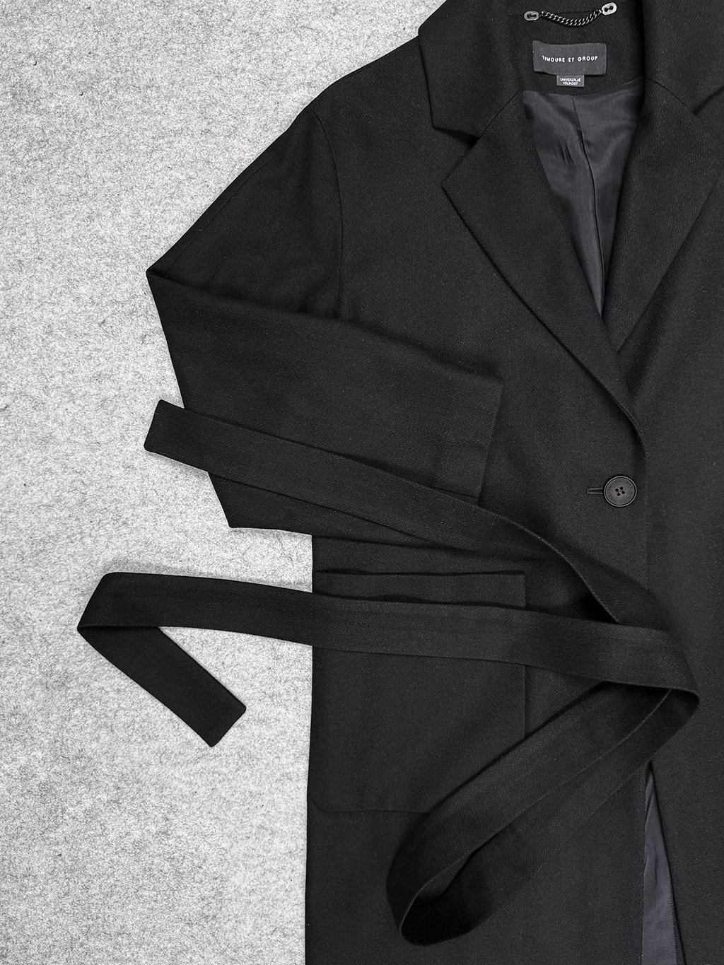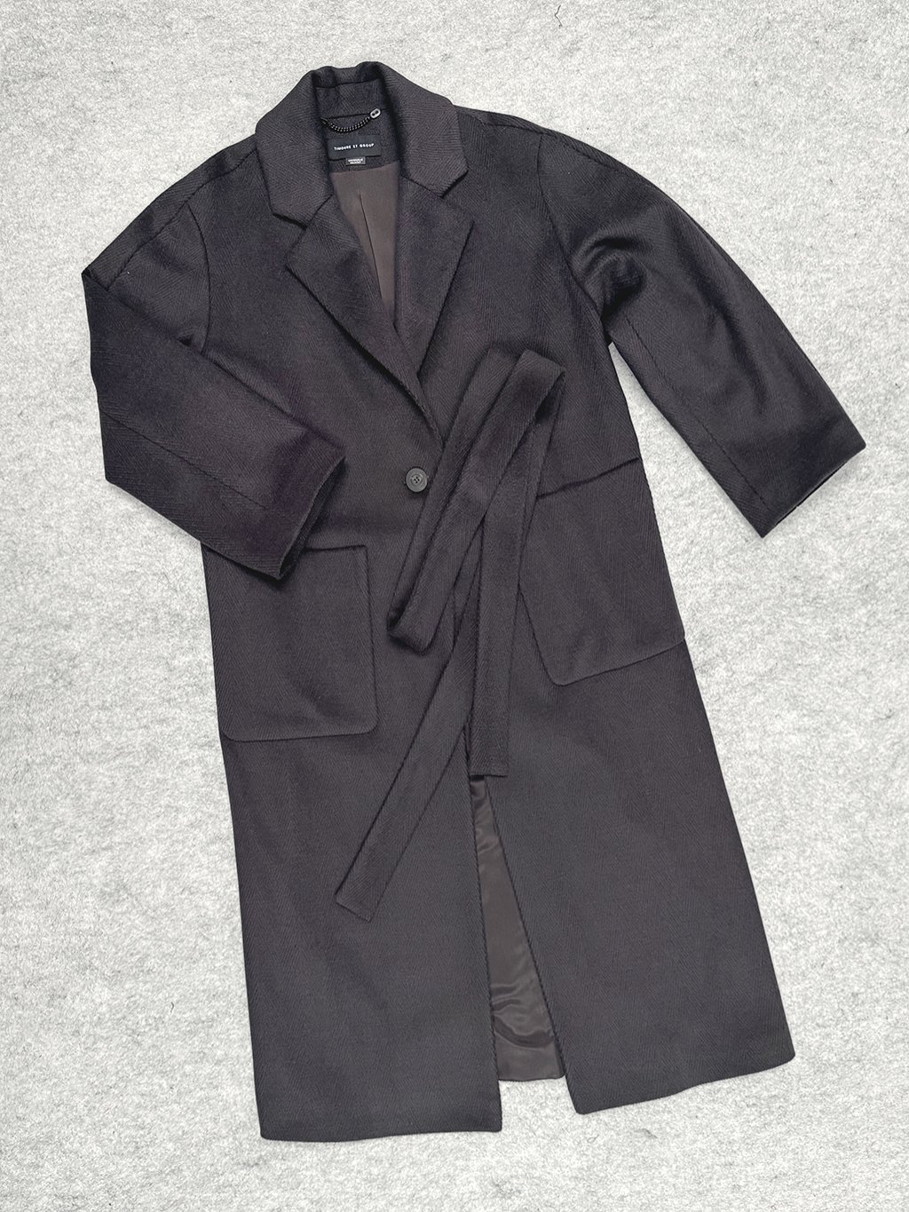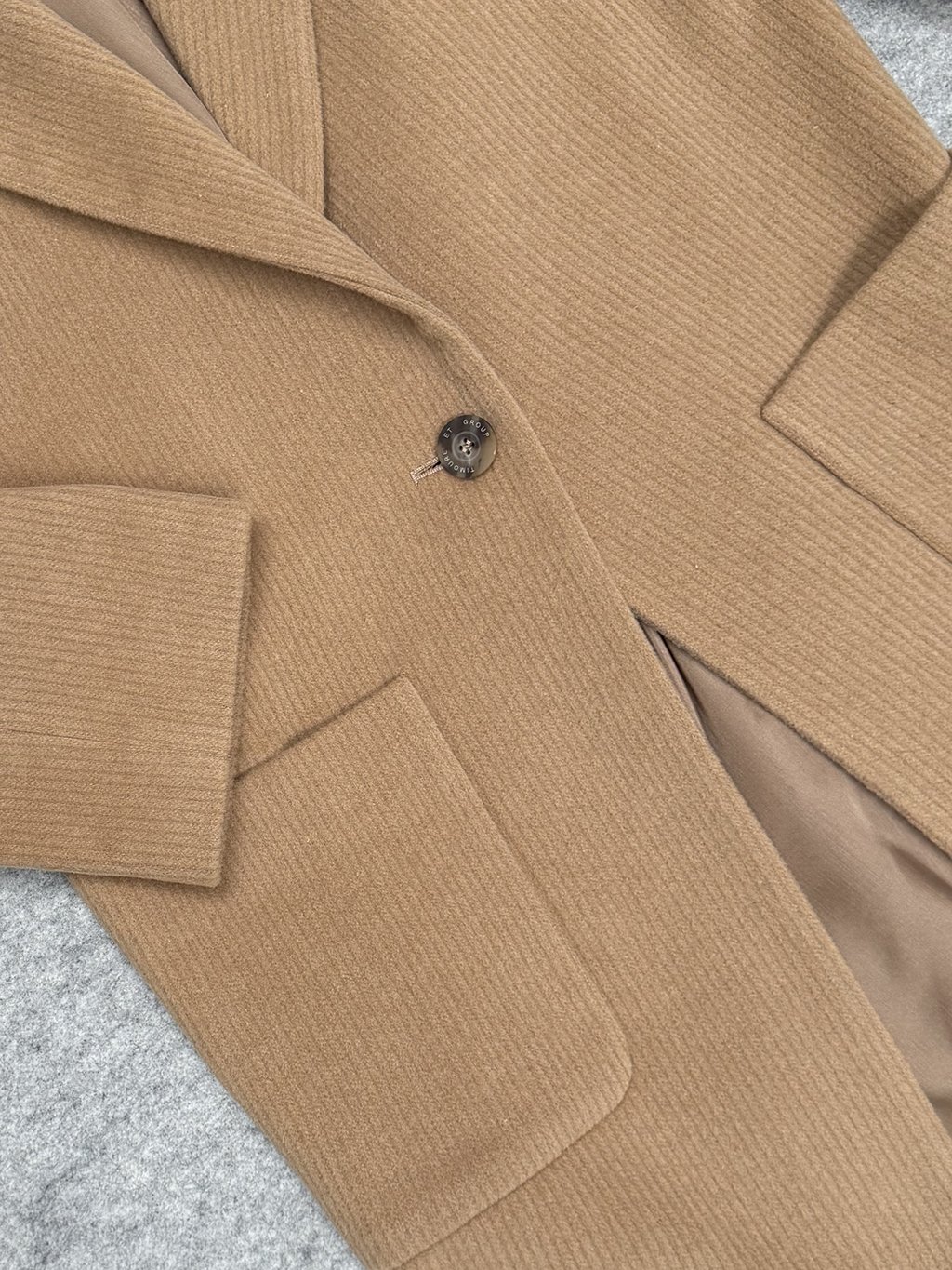 Delší kabát s klasickou fazonou má ideálně vyřešený střih, je zapnutý na jeden knoflík.