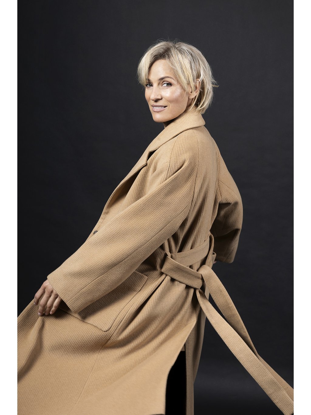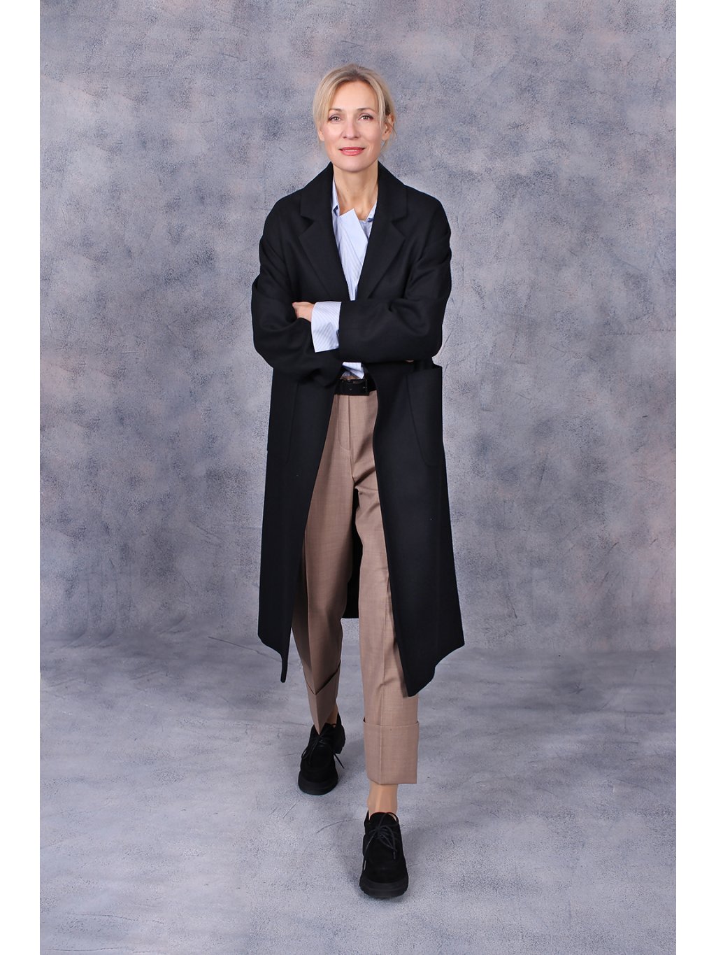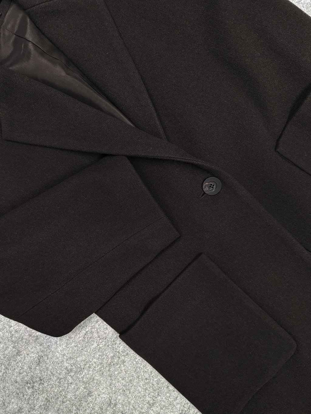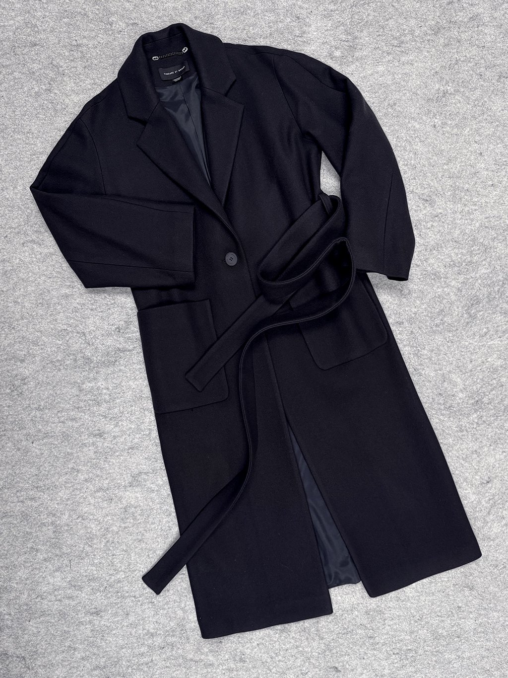 Delší kabát s klasickou fazonou má ideálně vyřešený střih, je zapnutý na jeden knoflík.