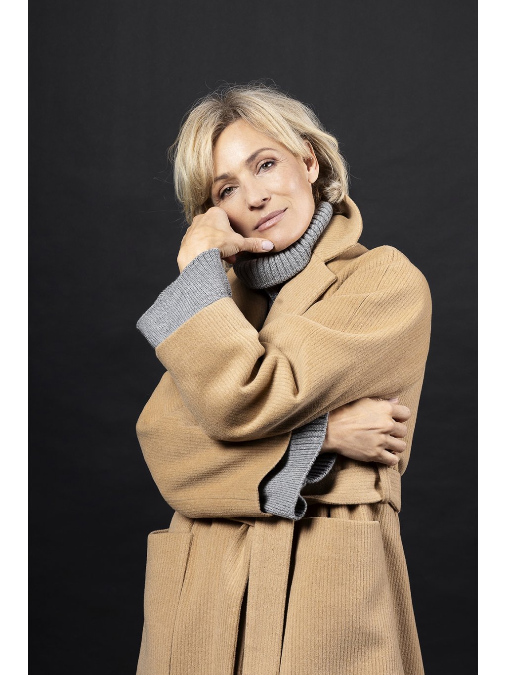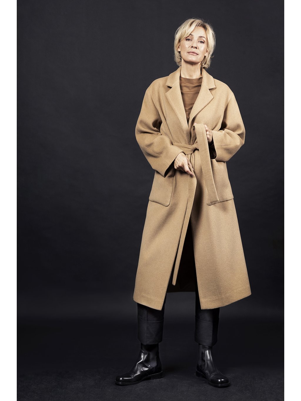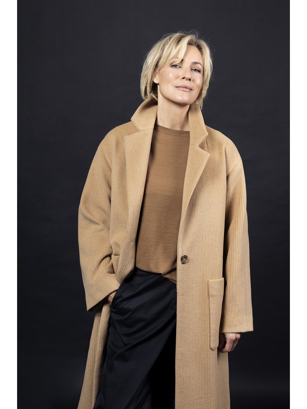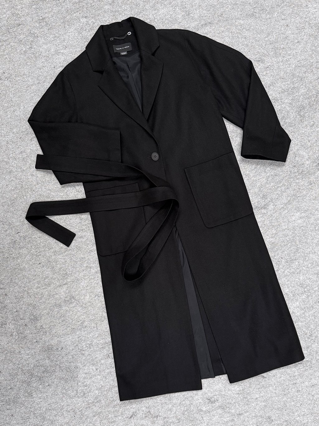 Delší kabát s klasickou fazonou má ideálně vyřešený střih, je zapnutý na jeden knoflík.