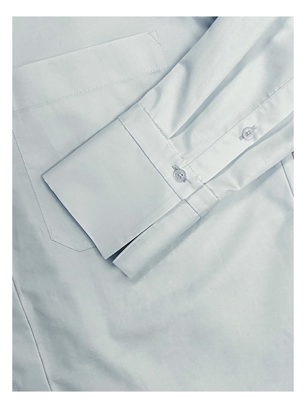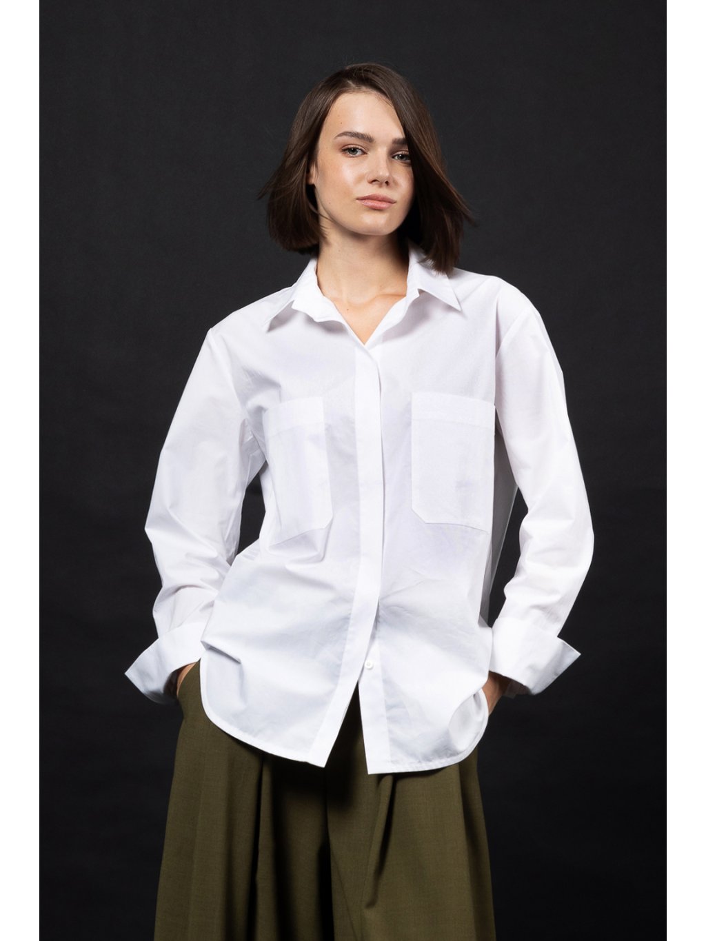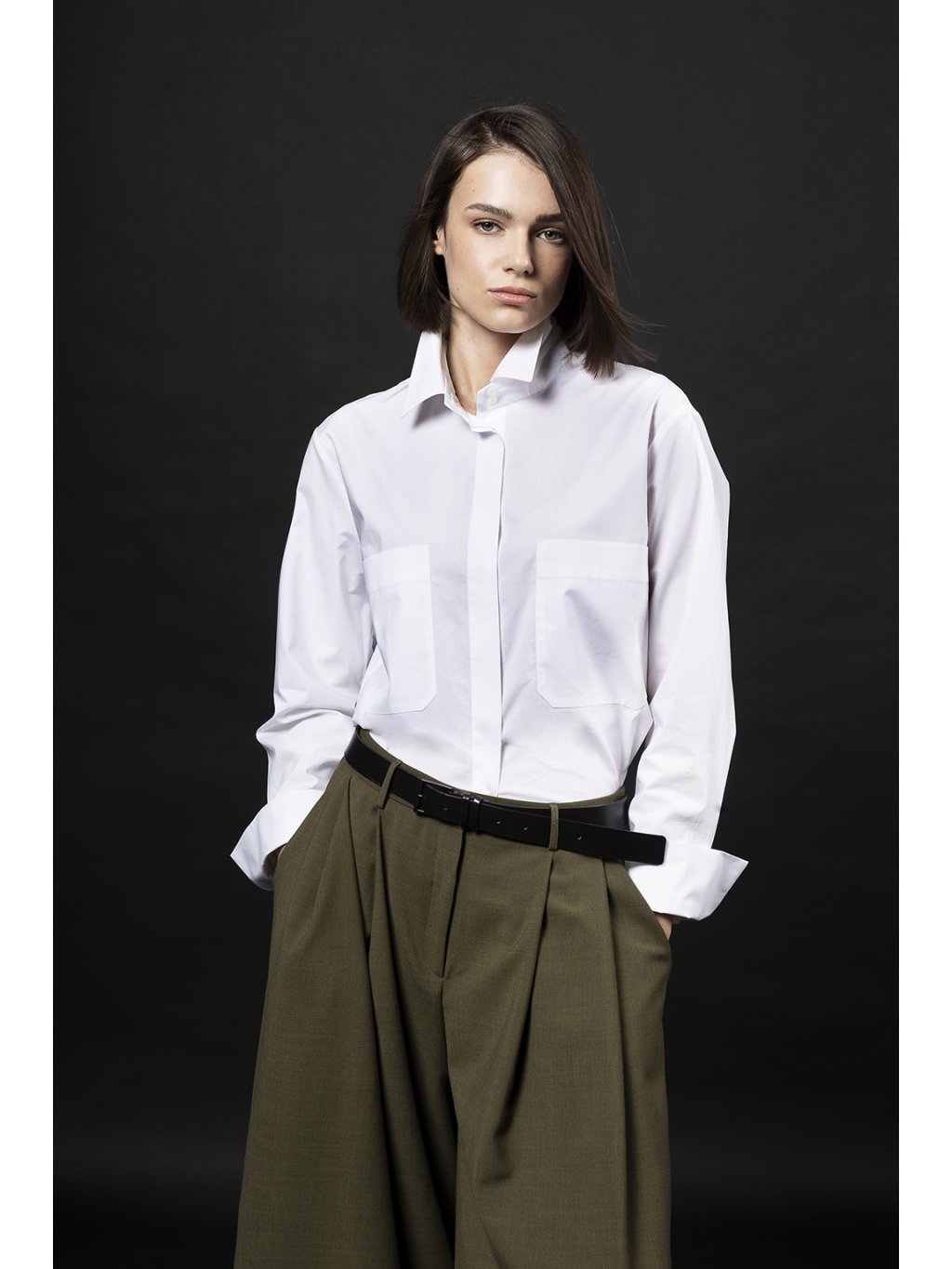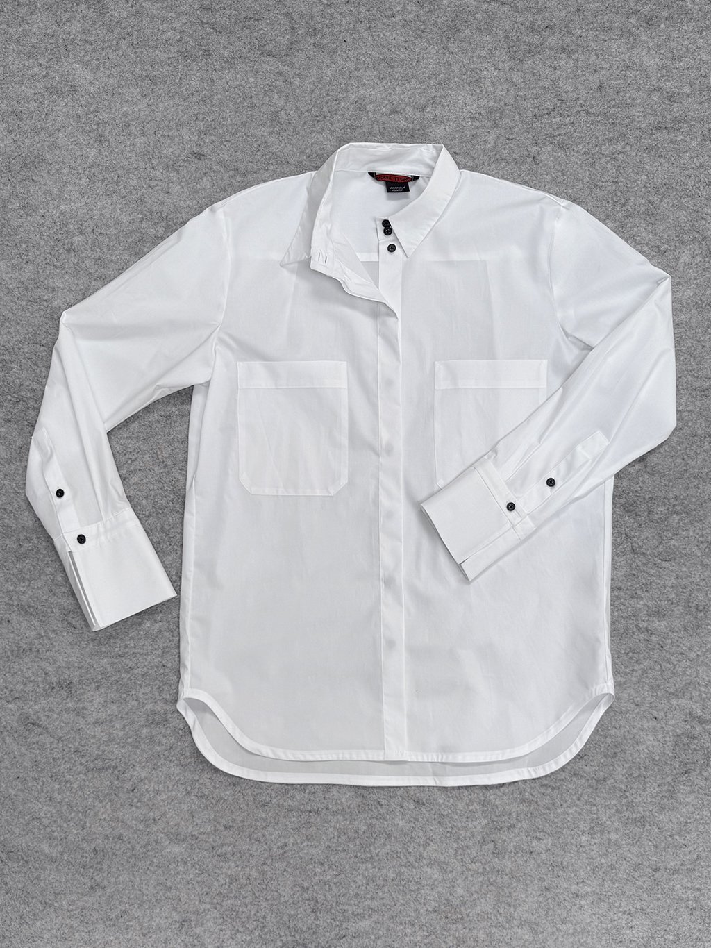Klasická košile s tvarovanou délkou má dlouhý rukáv s vyšší manžetou a dvě velké kapsy.