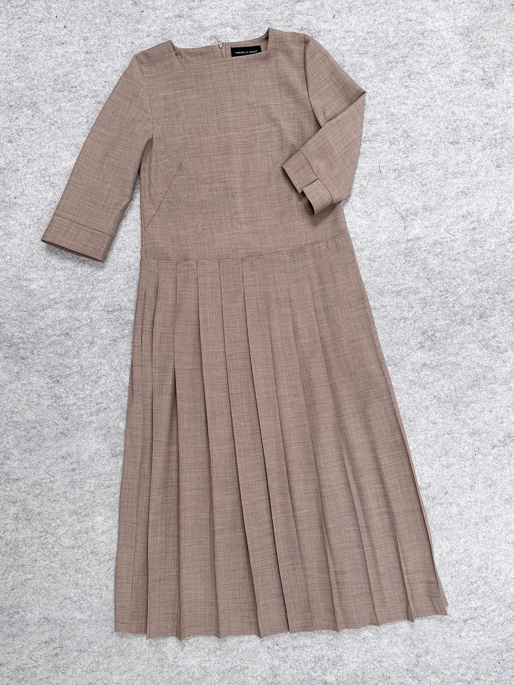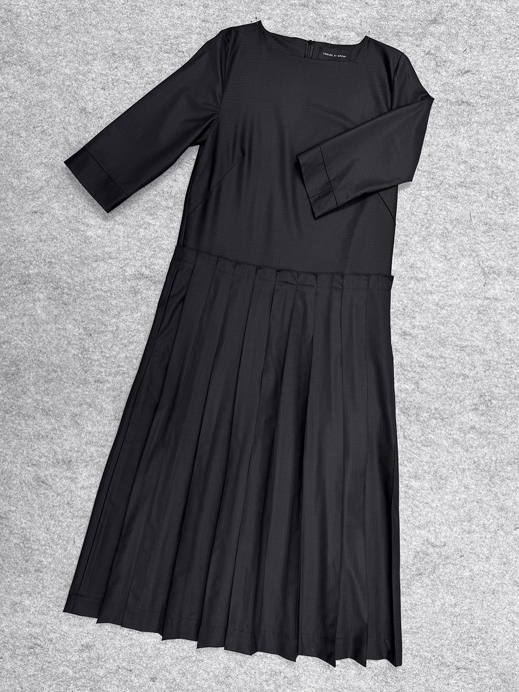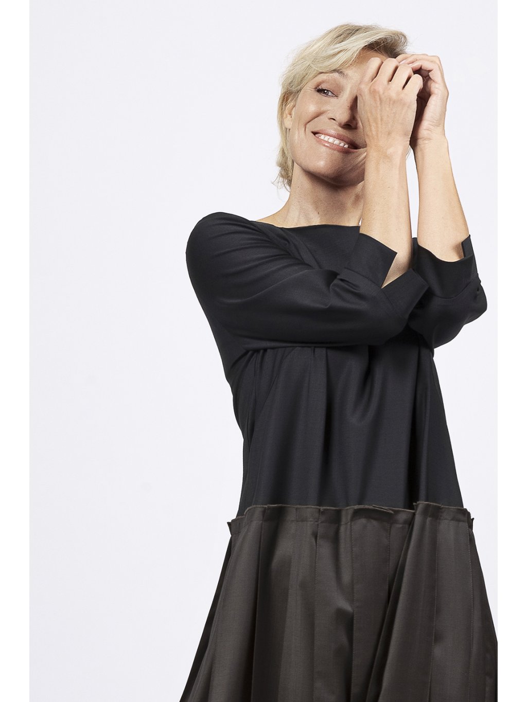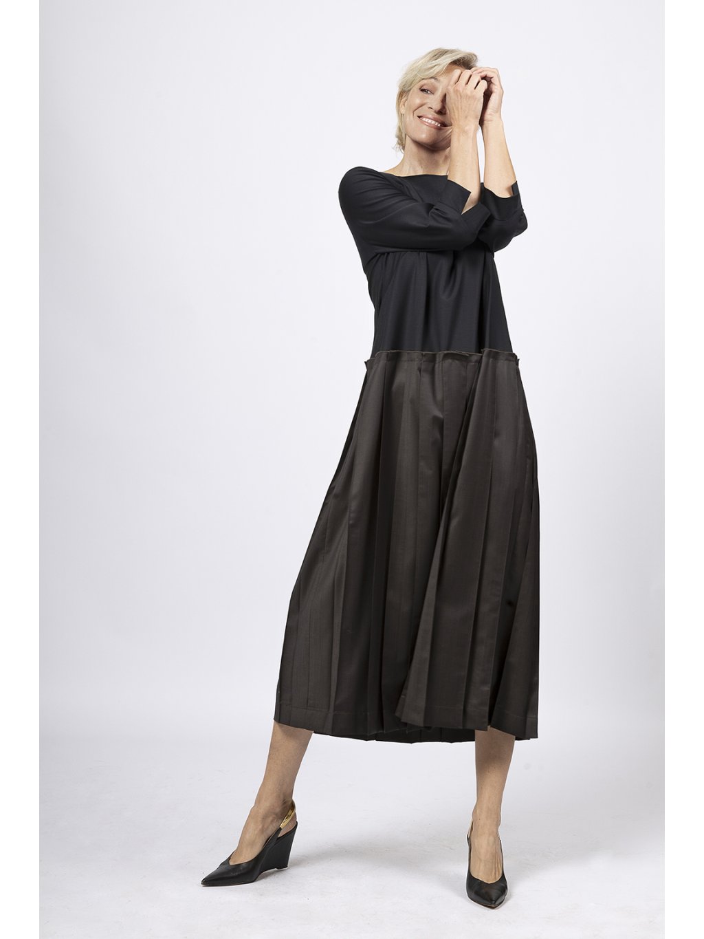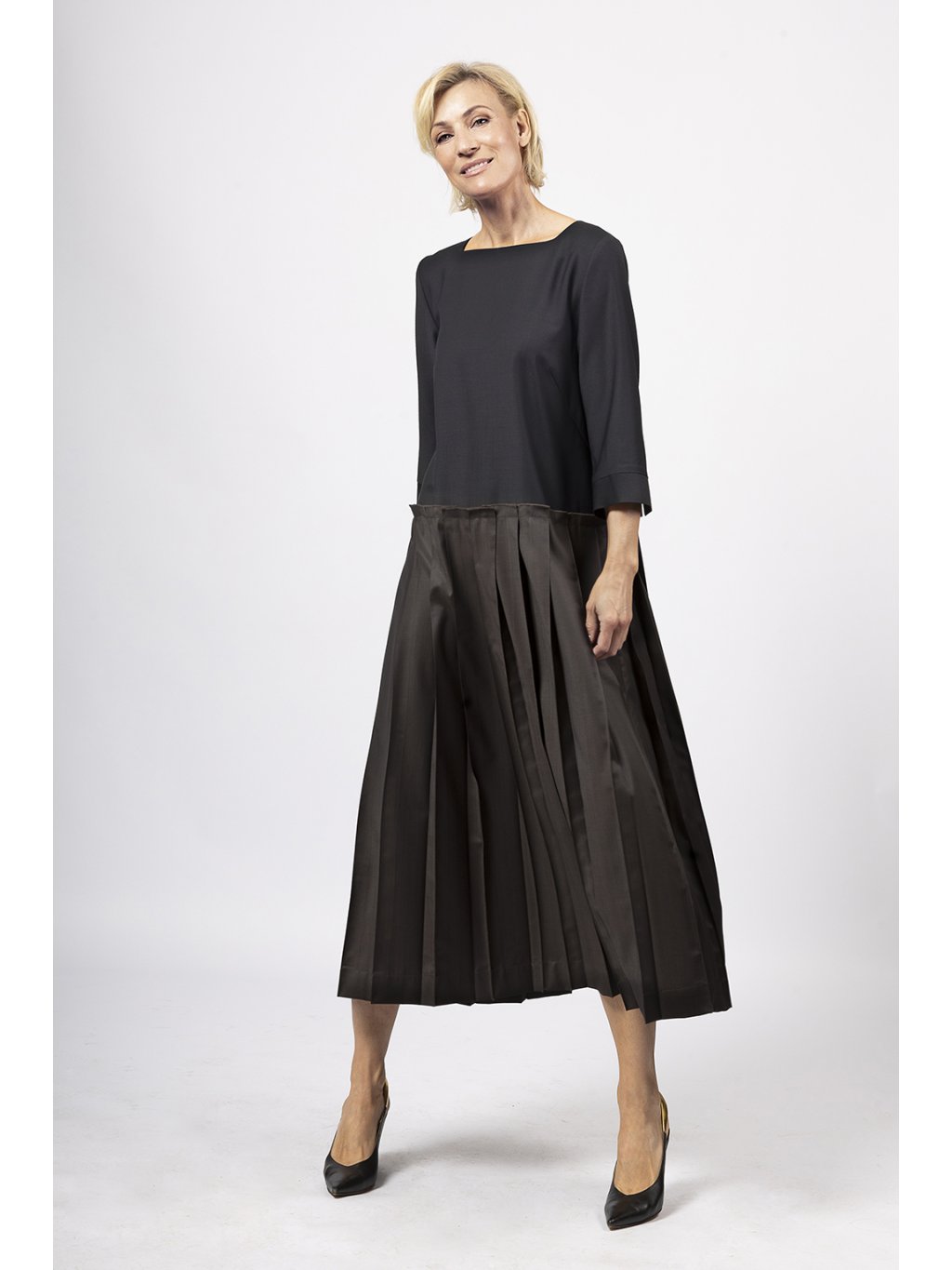 Šaty s lodičkovým výstřihem v siluetě A mají sukni s rovnými sklady a 3/4 rukáv.