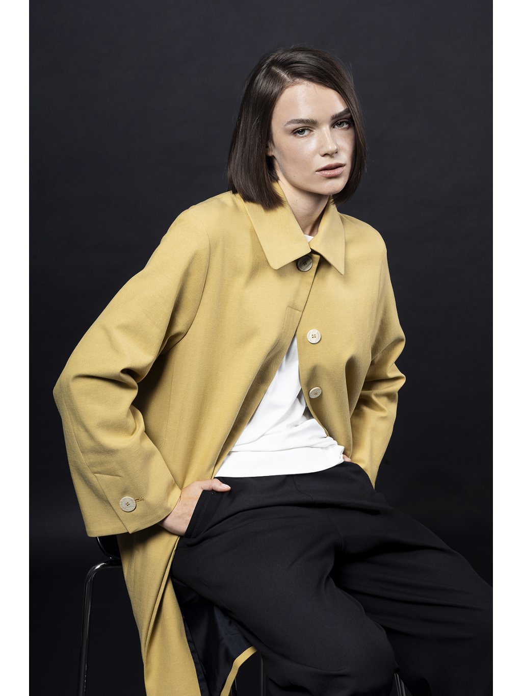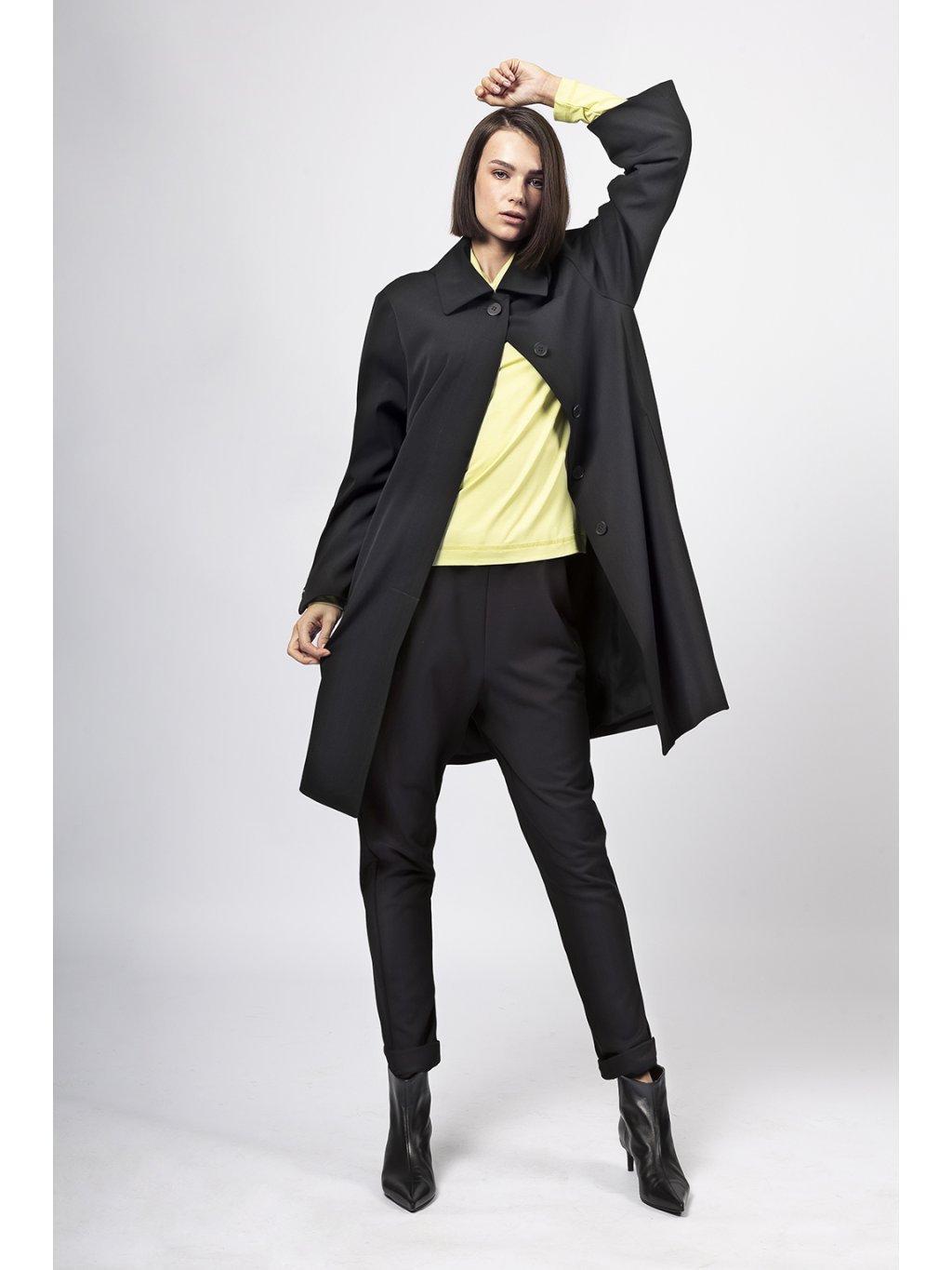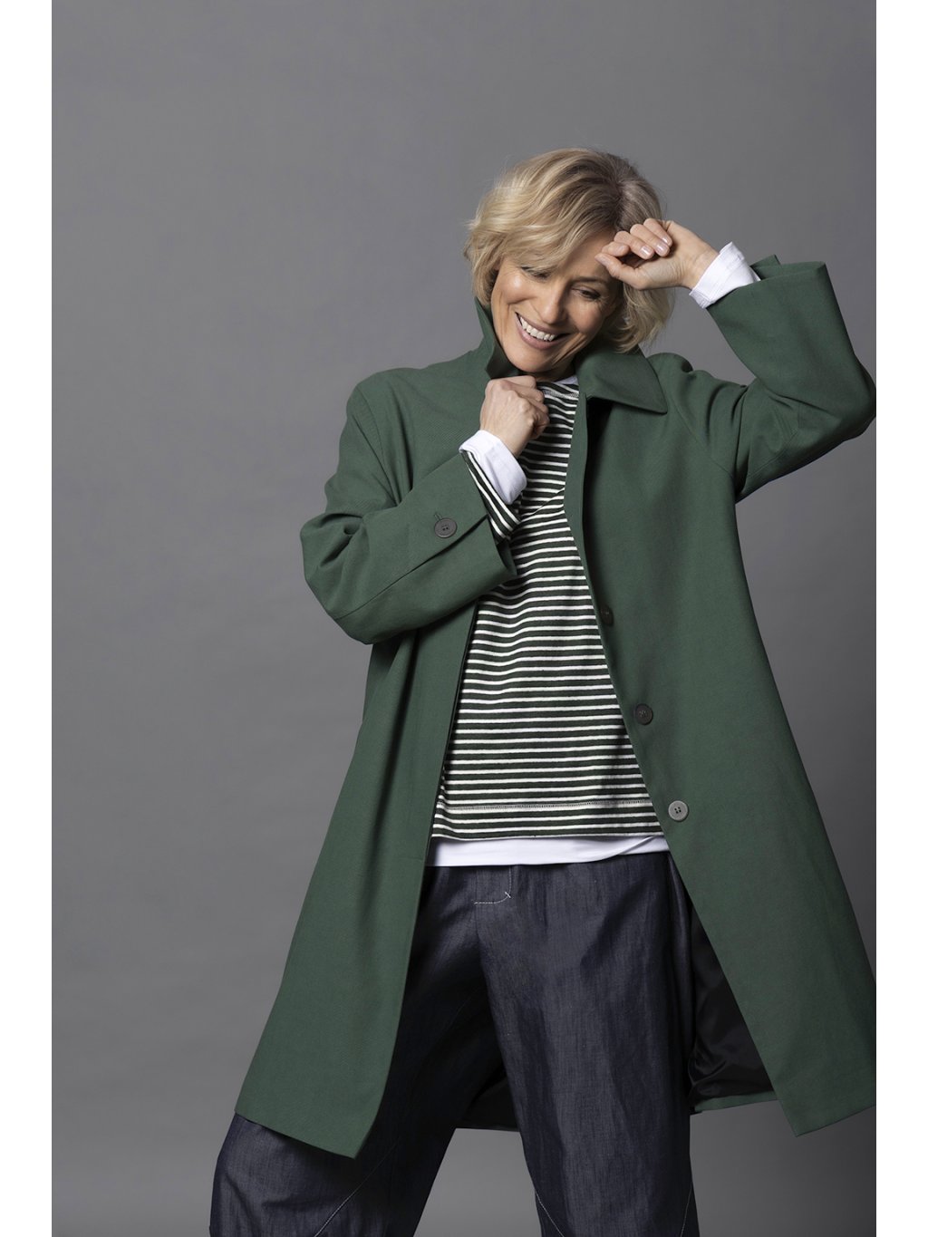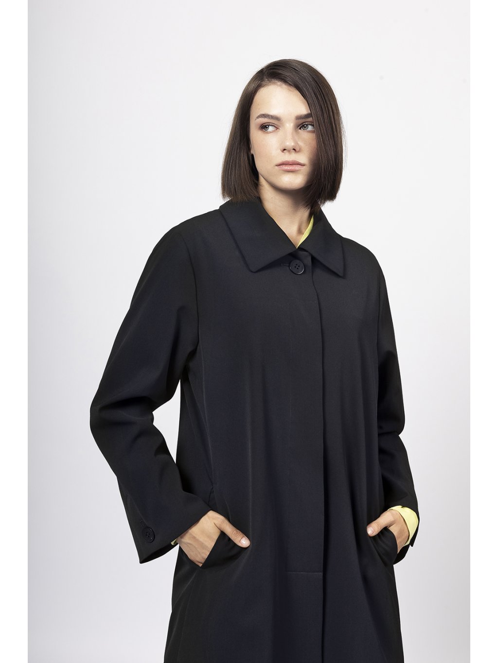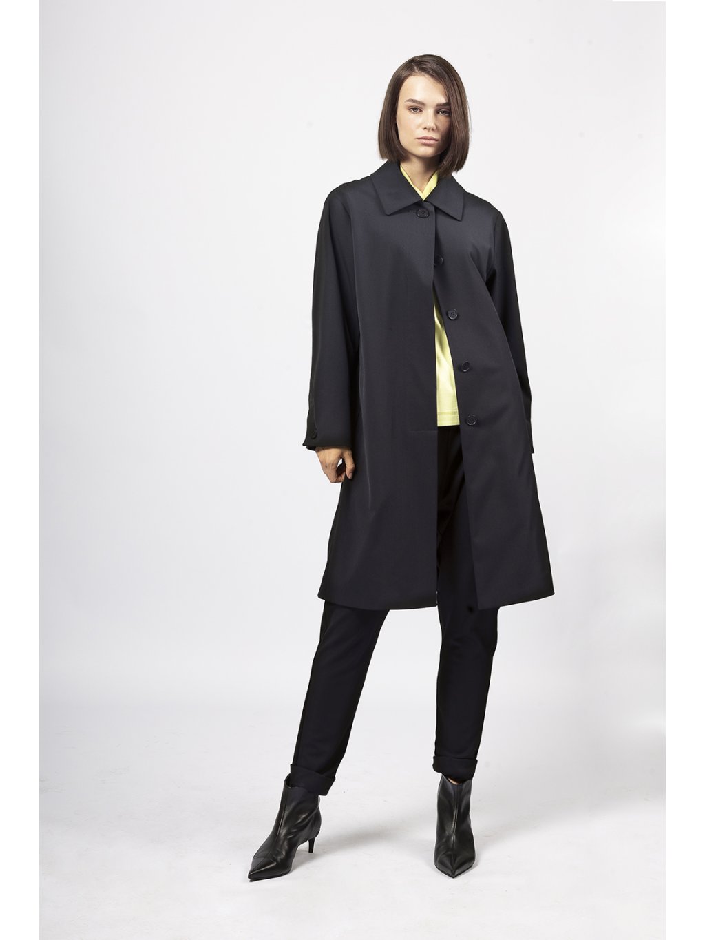 Rovný kabátek v délce nad koleno má límec a skryté zapínání a široký rukáv s rozparkem zapnutým na knoflík.