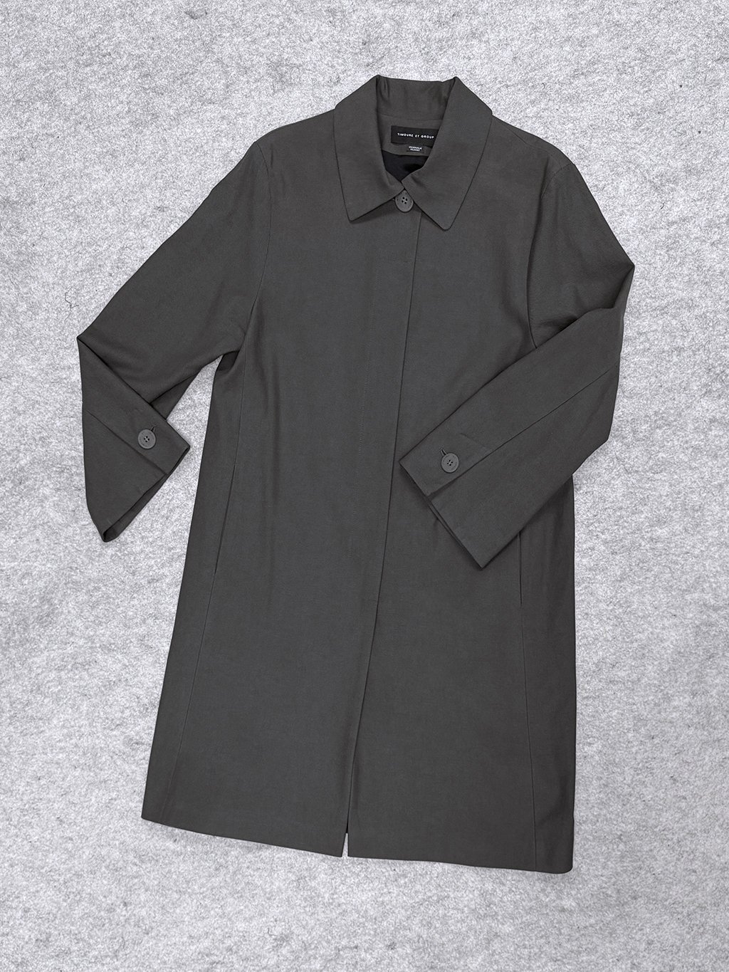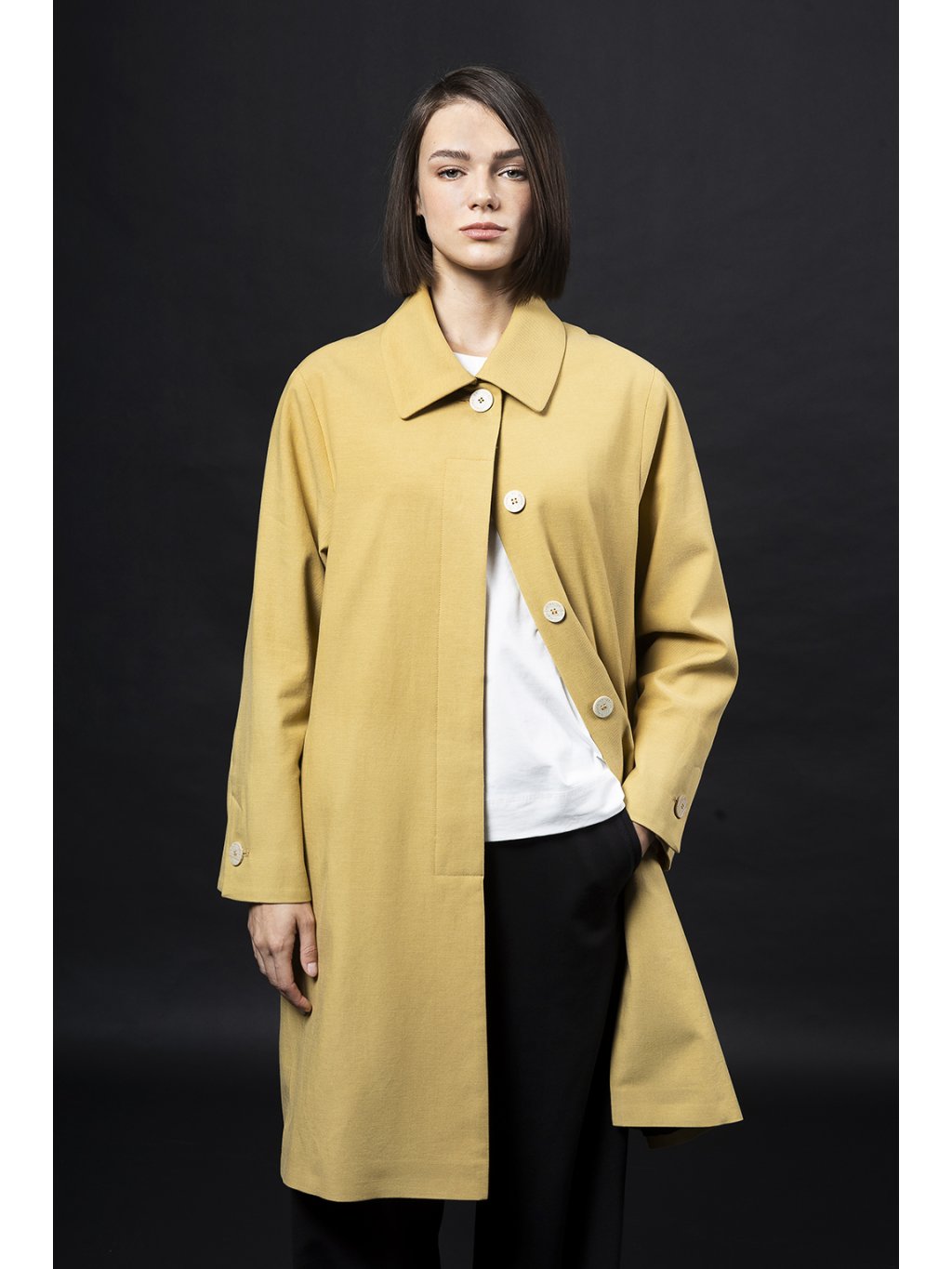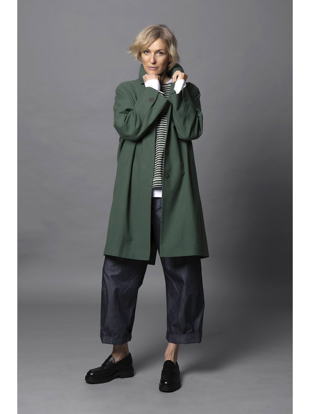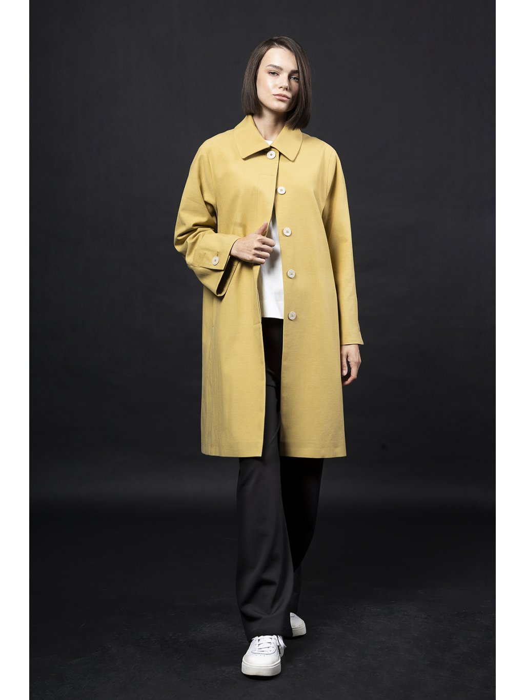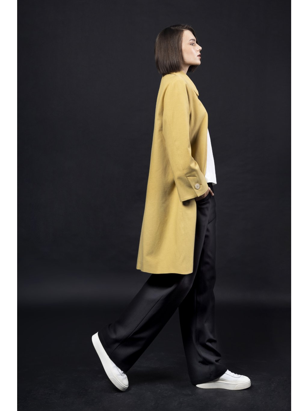 Rovný kabátek v délce nad koleno má límec a skryté zapínání a široký rukáv s rozparkem zapnutým na knoflík.