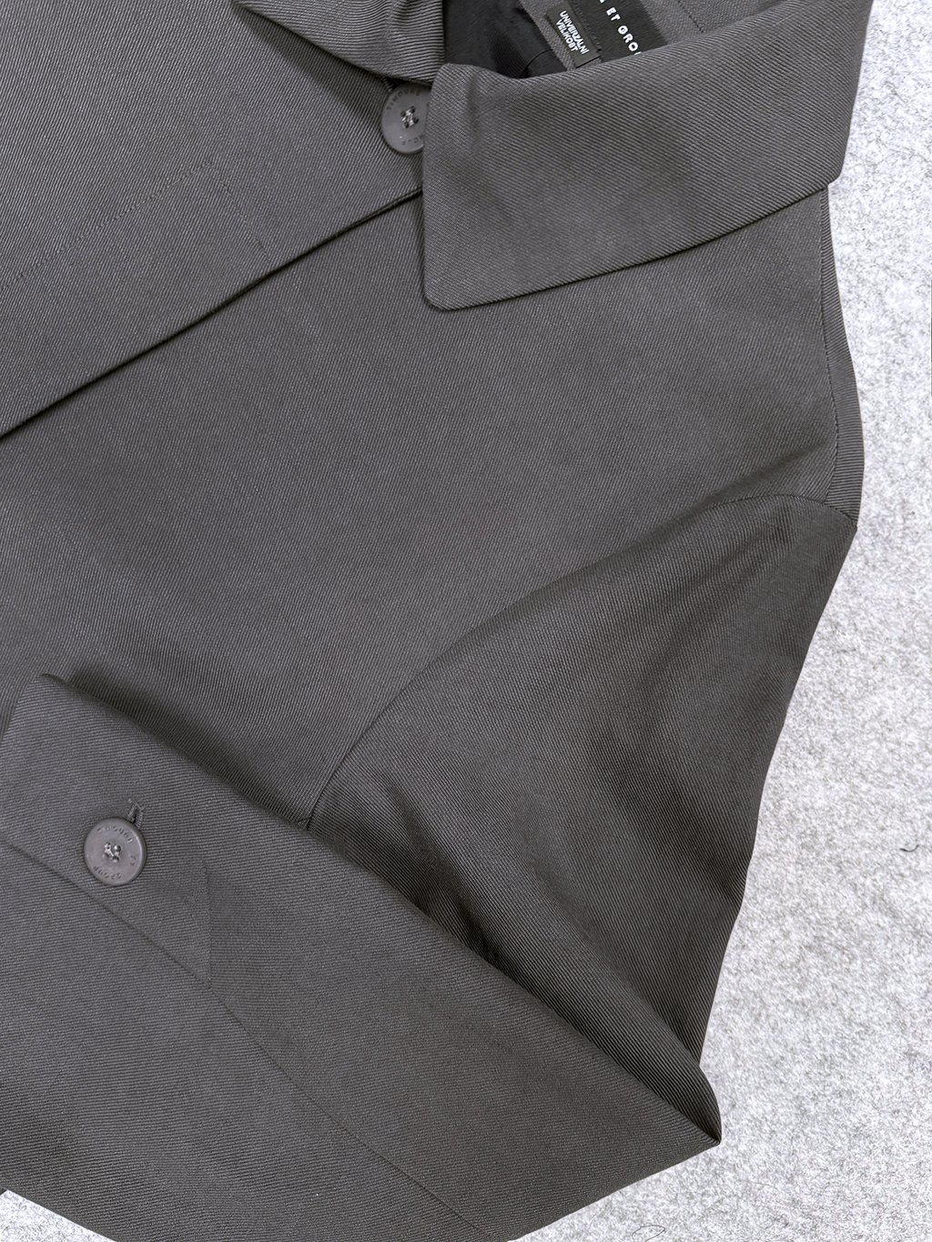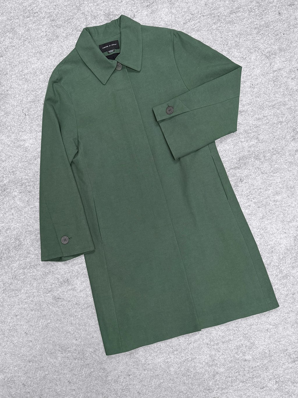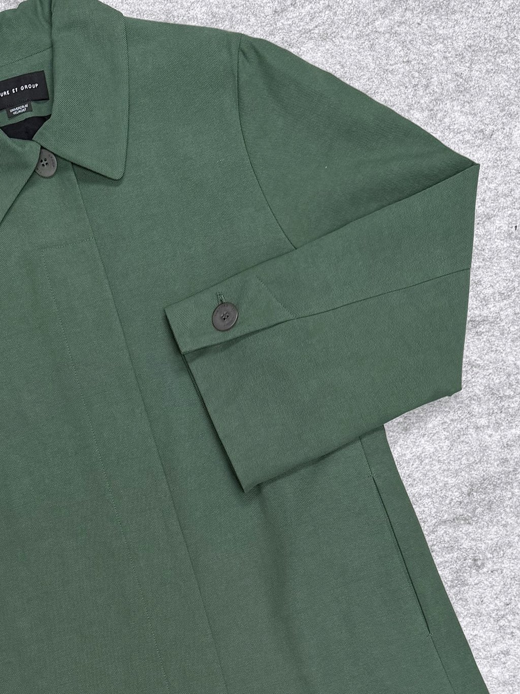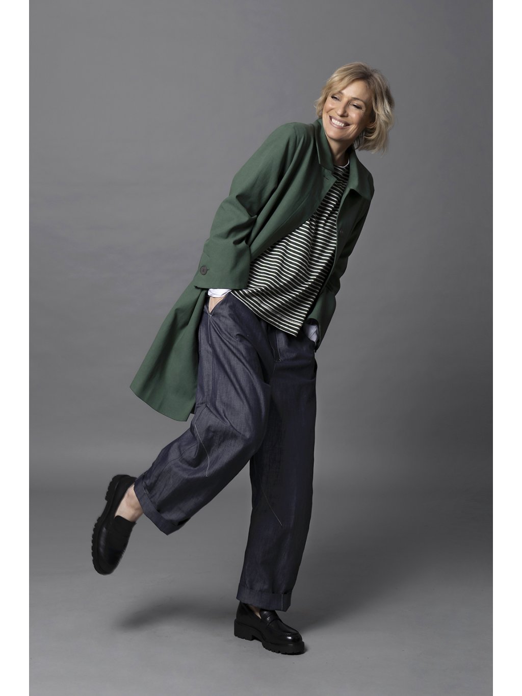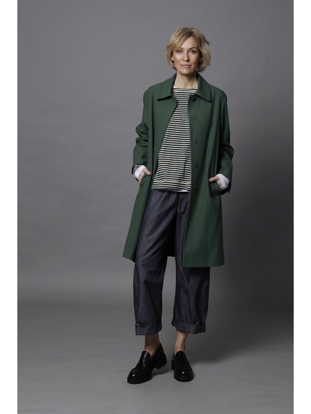 Rovný kabátek v délce nad koleno má límec a skryté zapínání a široký rukáv s rozparkem zapnutým na knoflík.