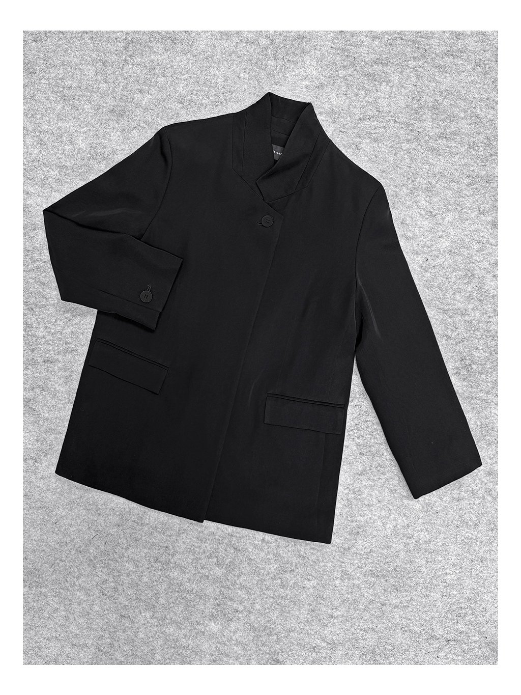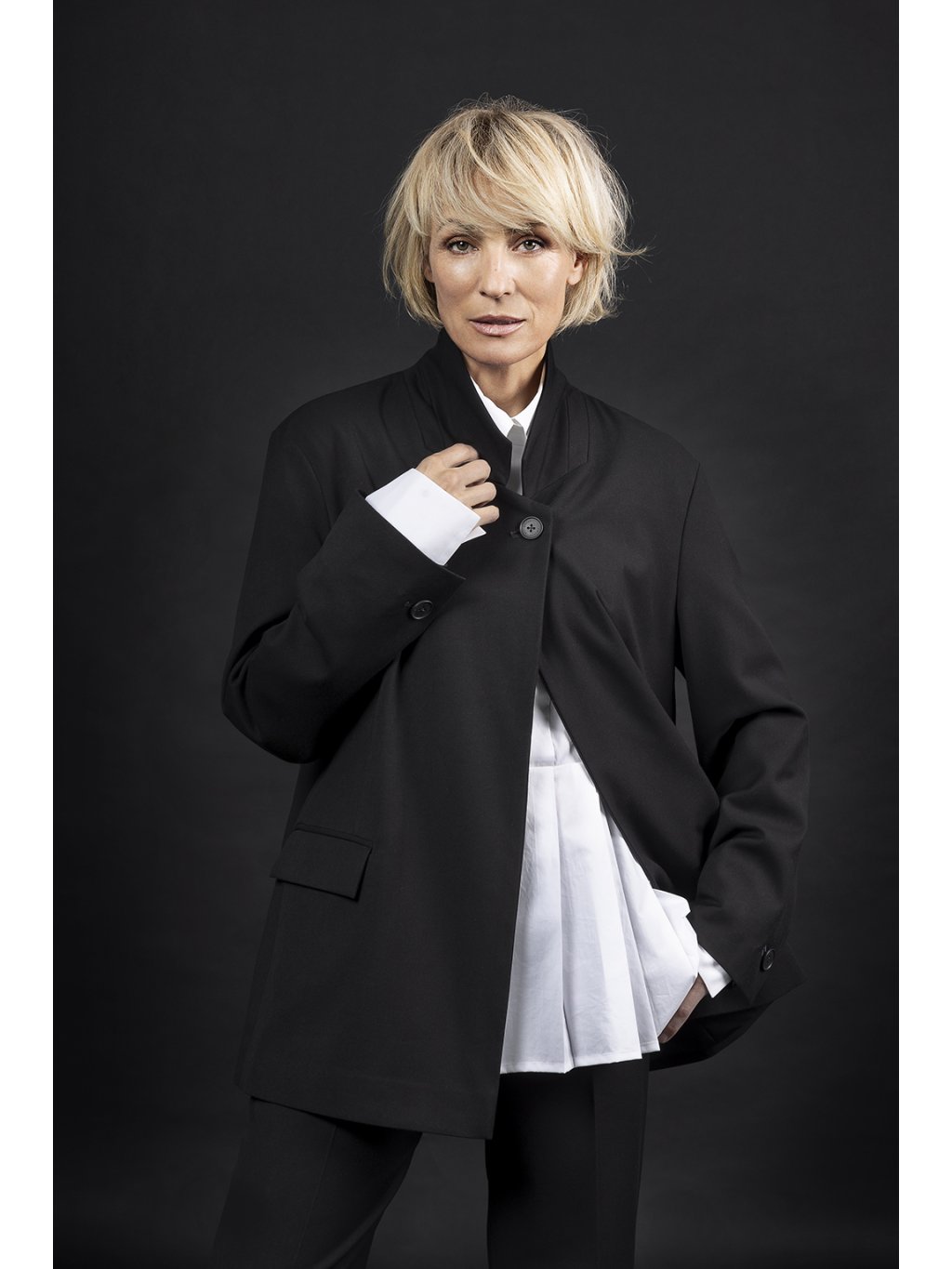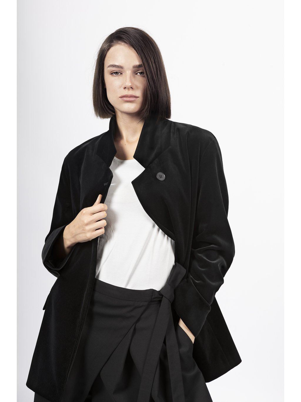 Sako s vyšším stojákem v nové aktuální linii zapnuté na jeden knoflík.
