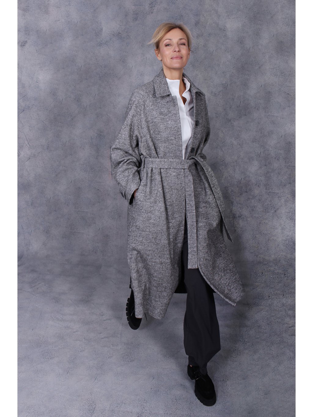 Dlouhý kabát s límcem a vázačkou má hluboký raglánový průramek a zaoblený širší rukáv.