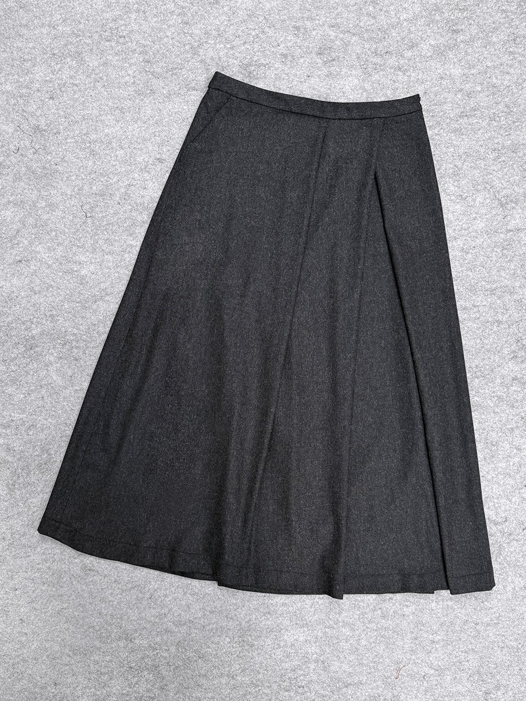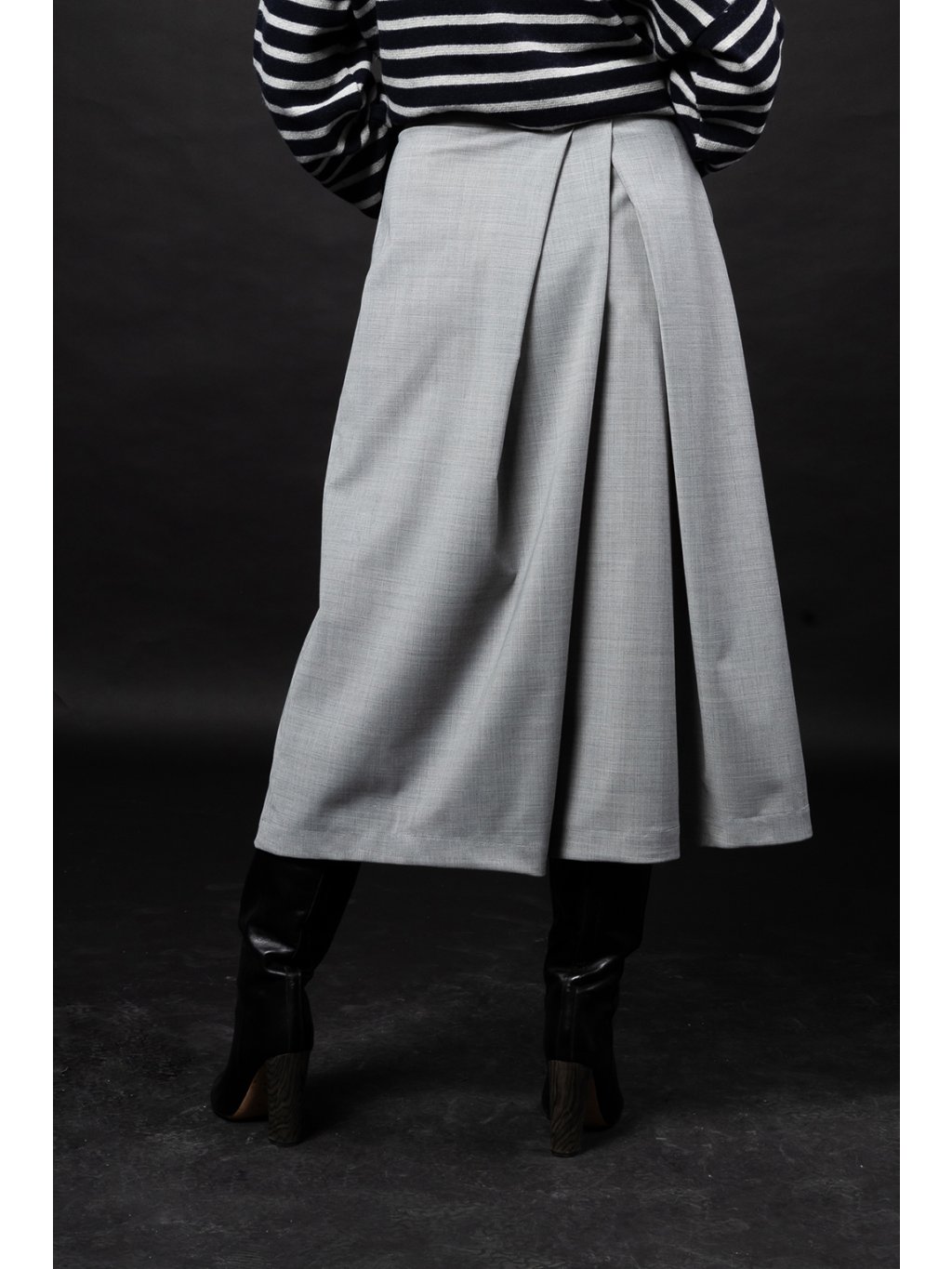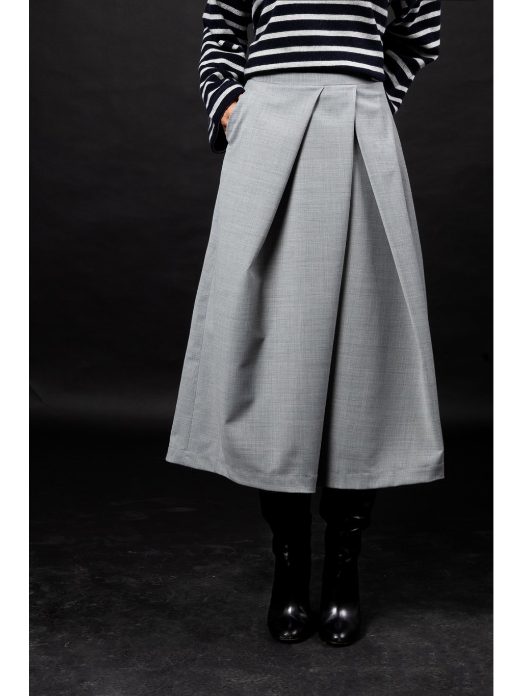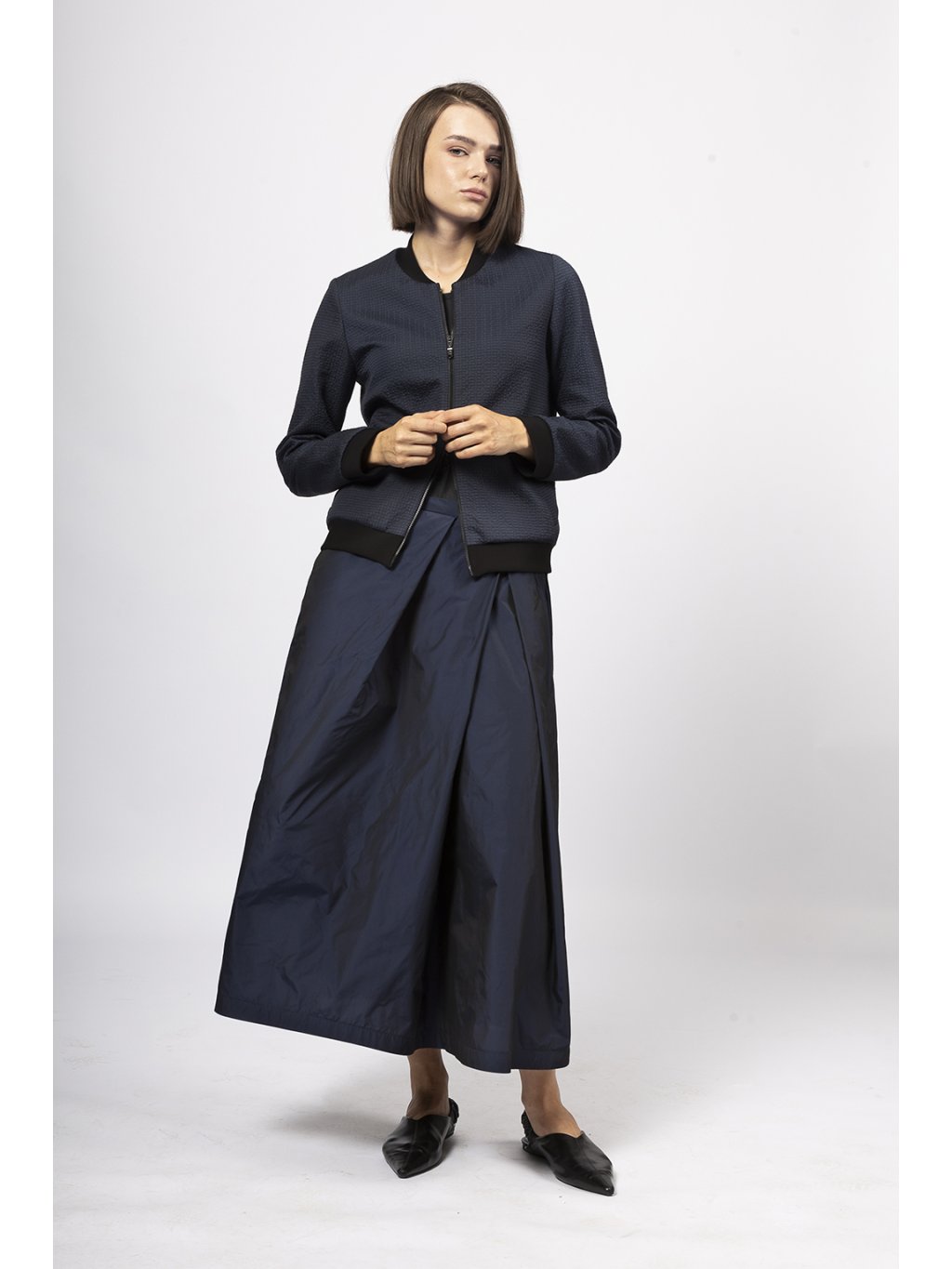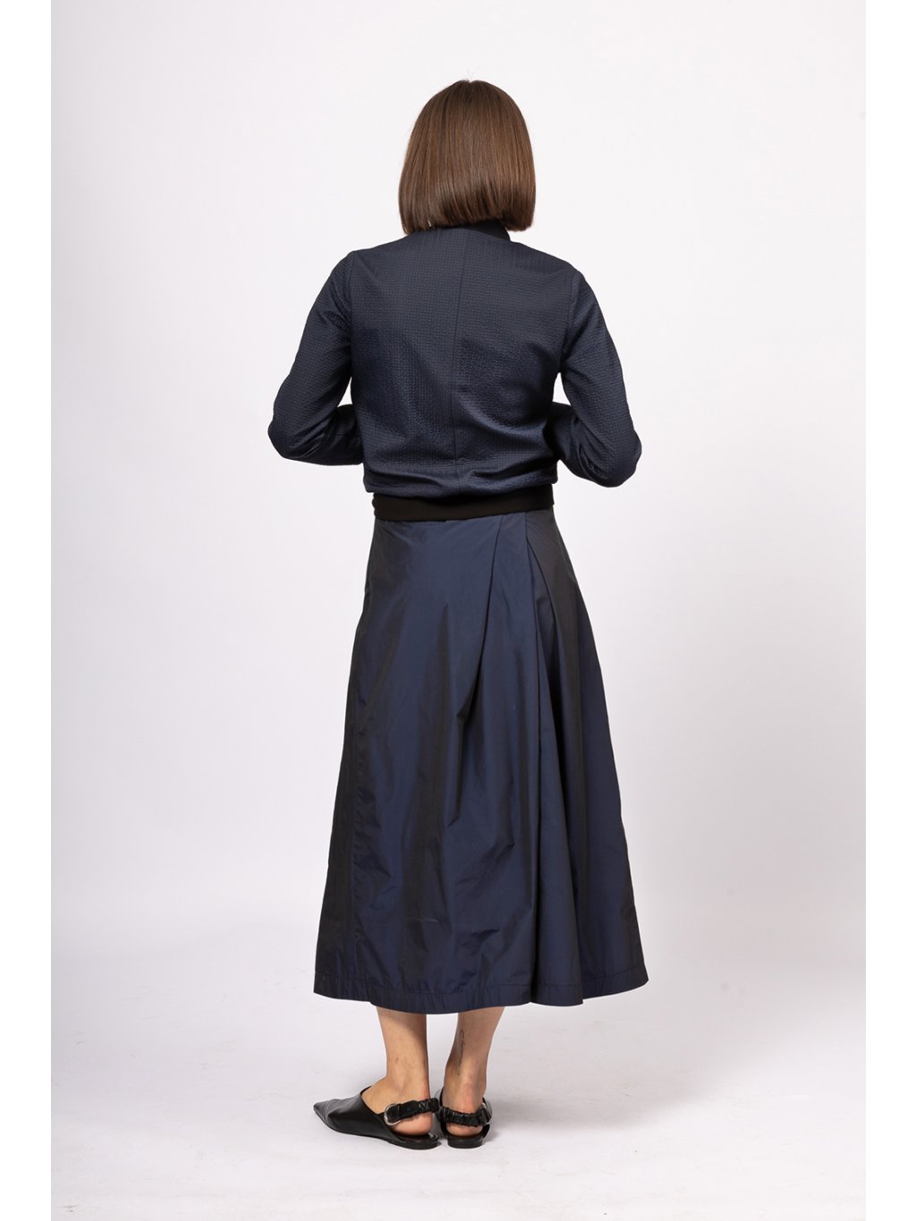 Sukně s asymetrickými sklady na předním i zadním dílu je z různých zajímavých materiálů.