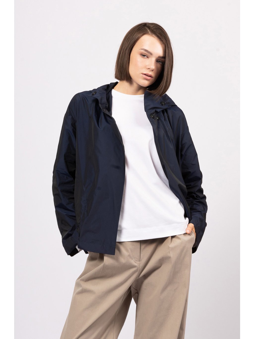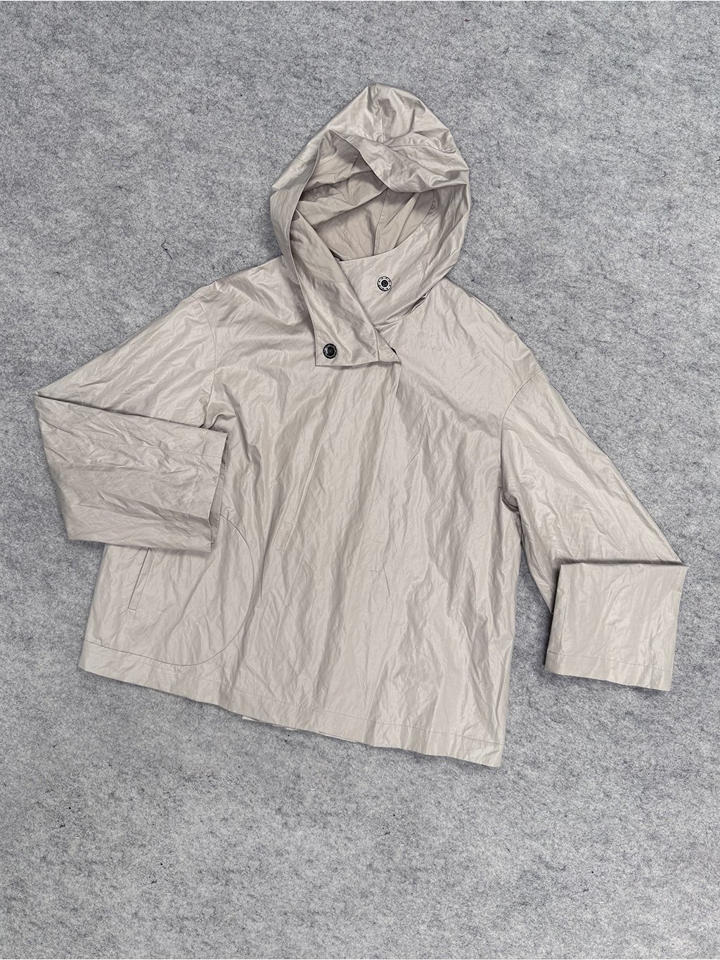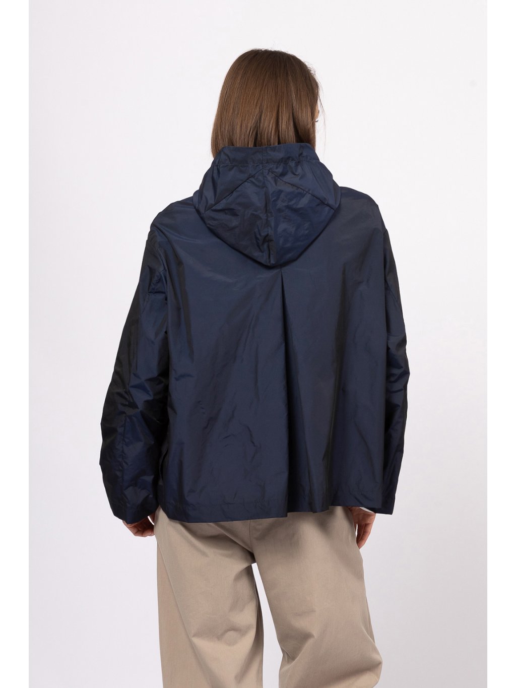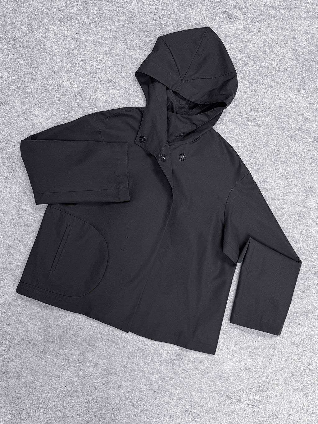 Bundička s kapucí ve zkrácené proporci je rozšířená hlubokým protizáhybem na zadním dílu a má zapínání na patenty.