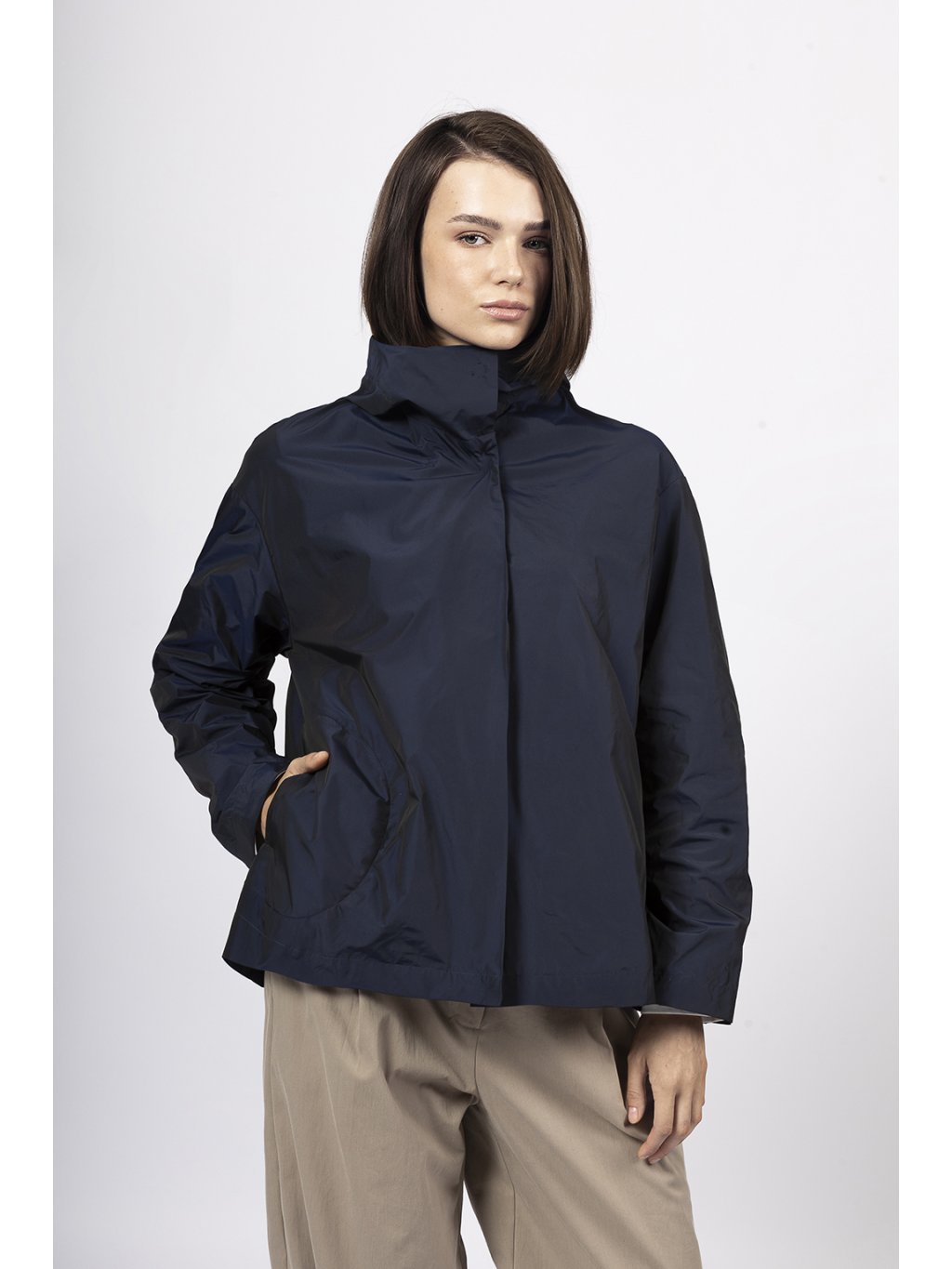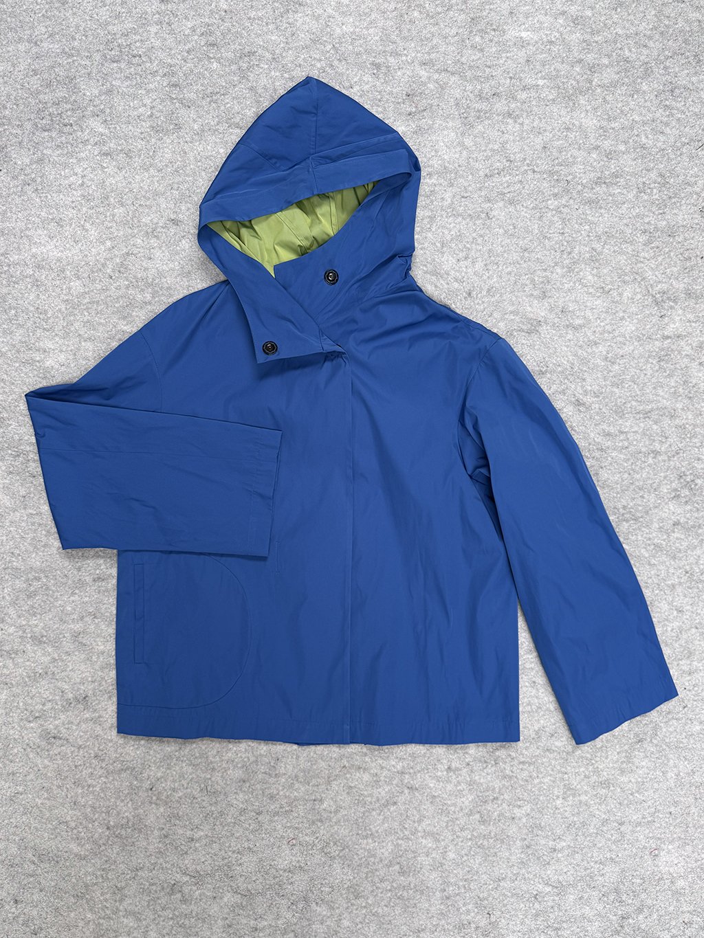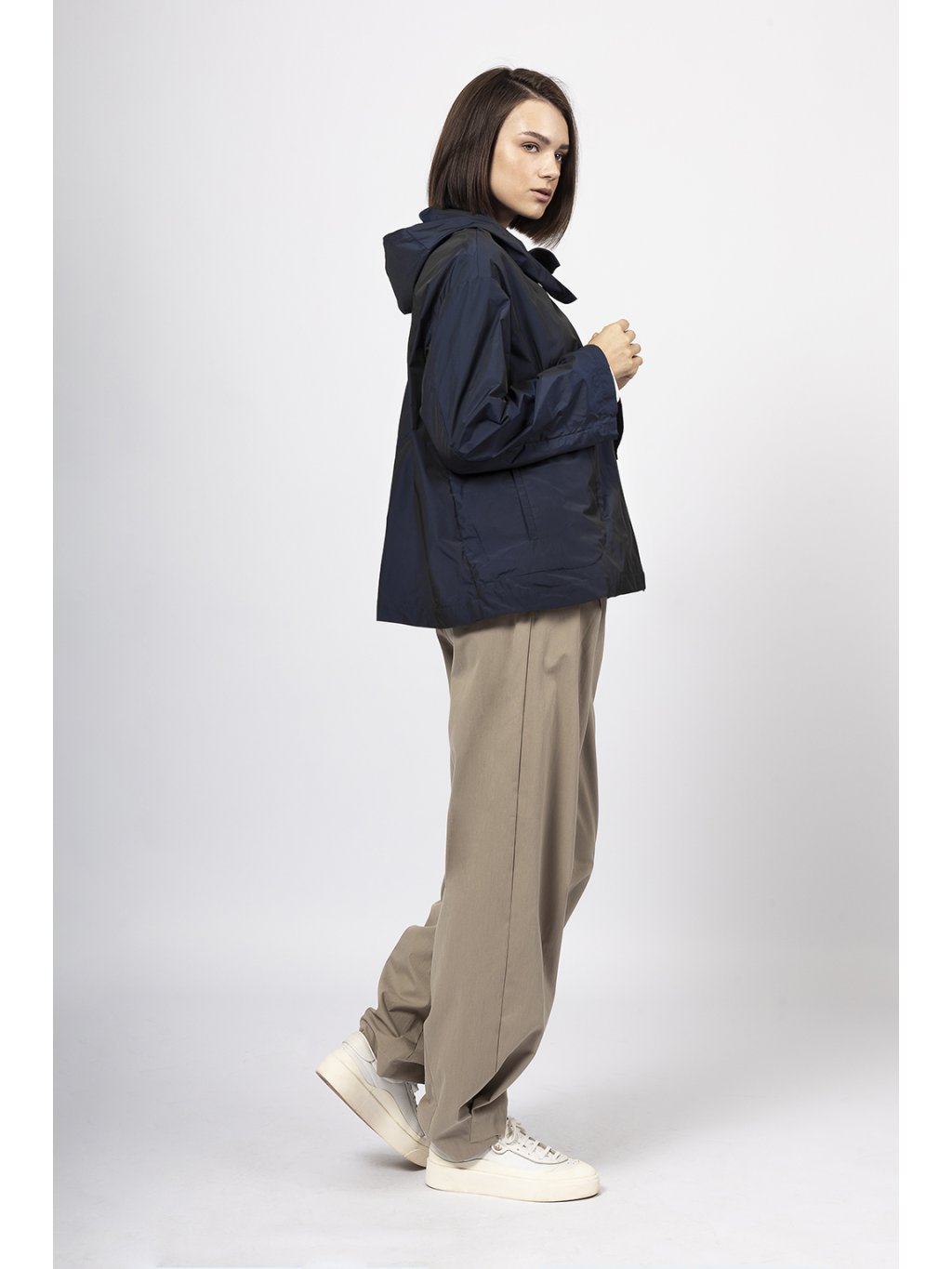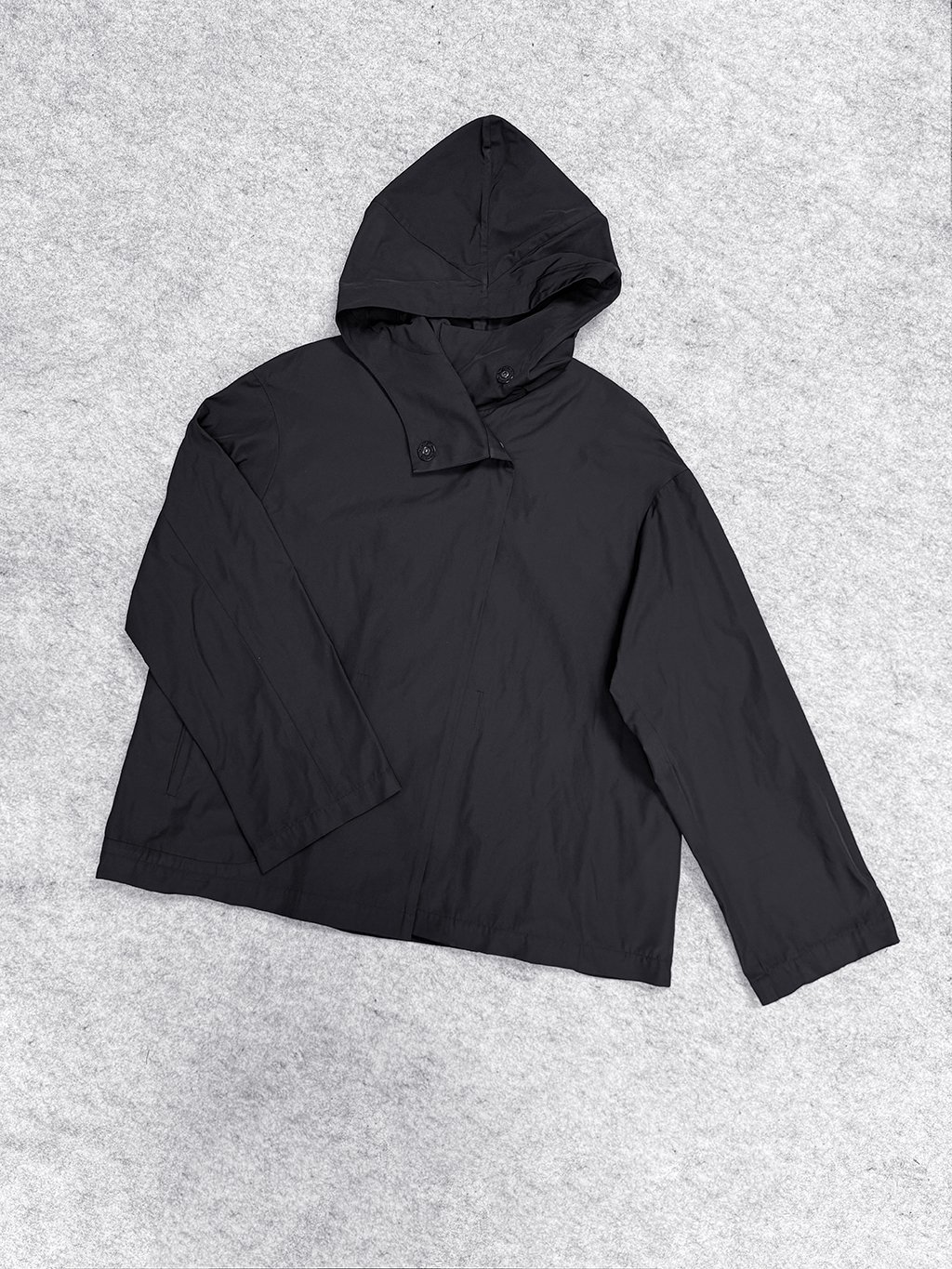 Bundička s kapucí ve zkrácené proporci je rozšířená hlubokým protizáhybem na zadním dílu a má zapínání na patenty.