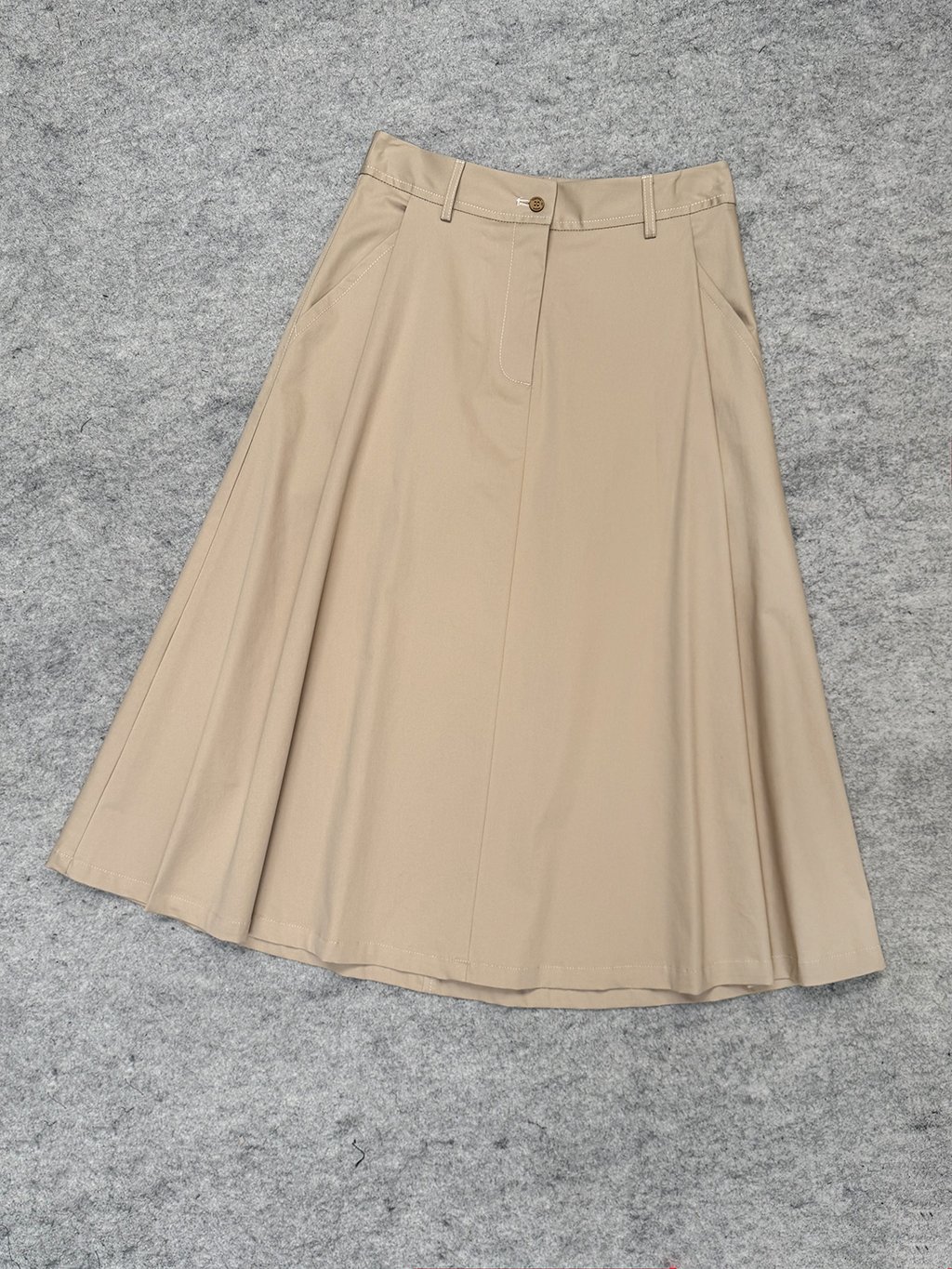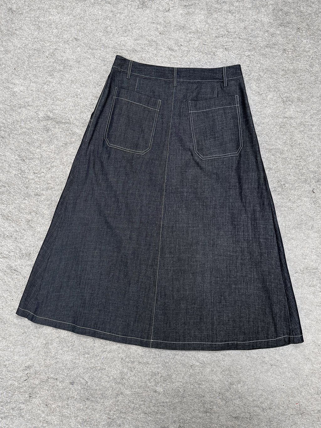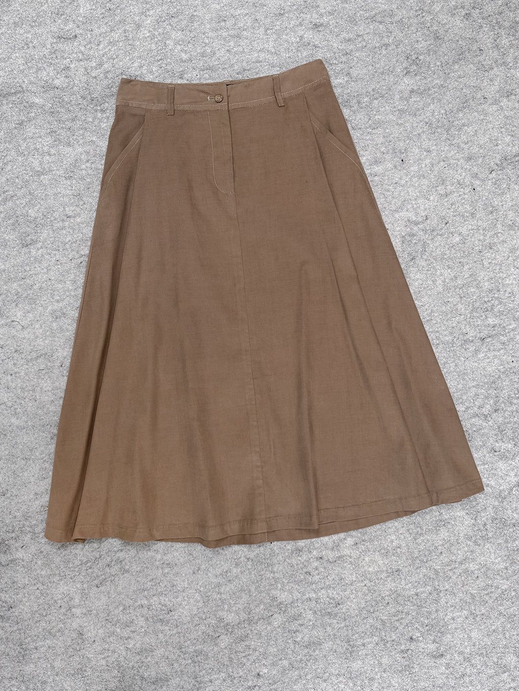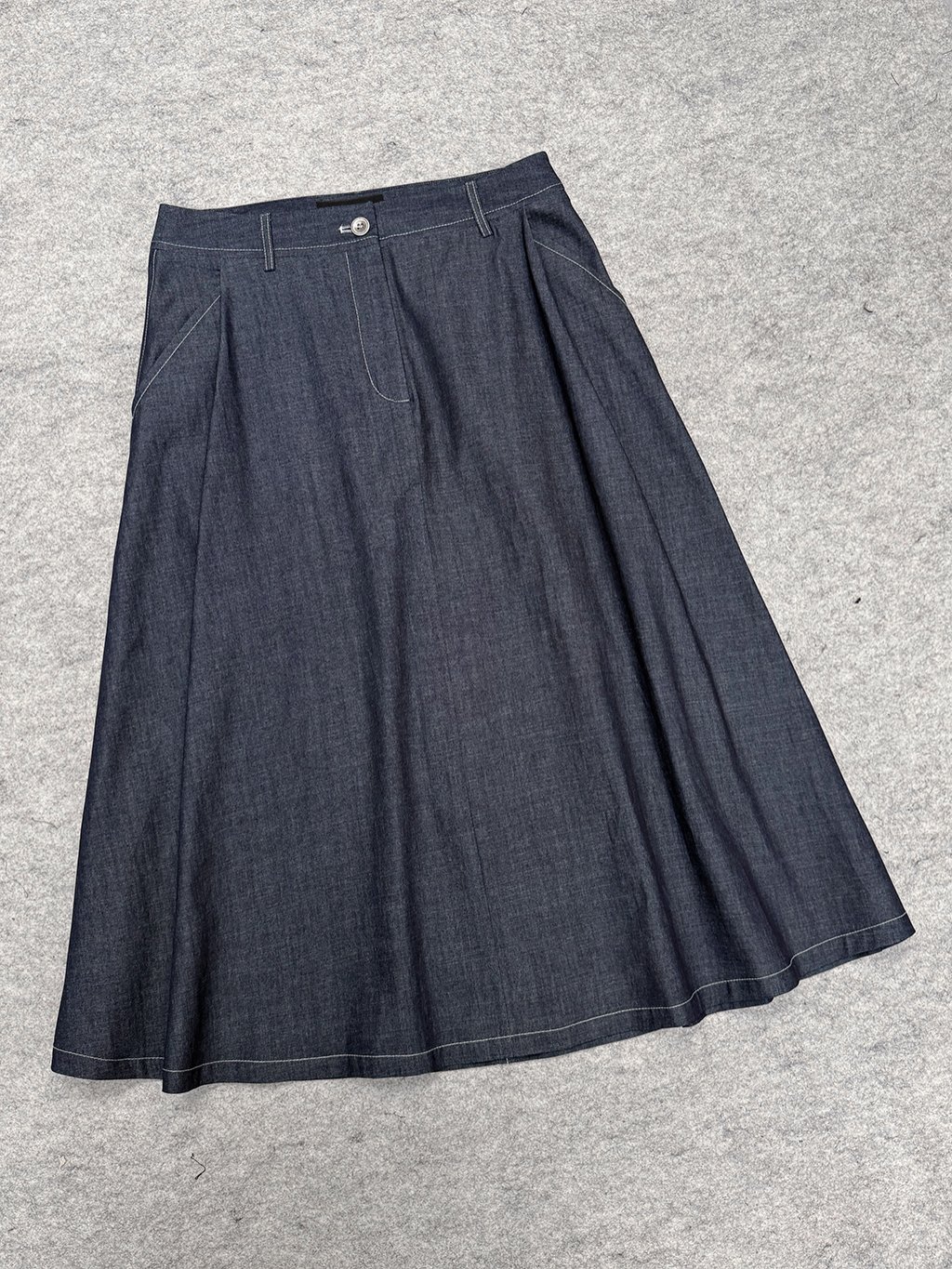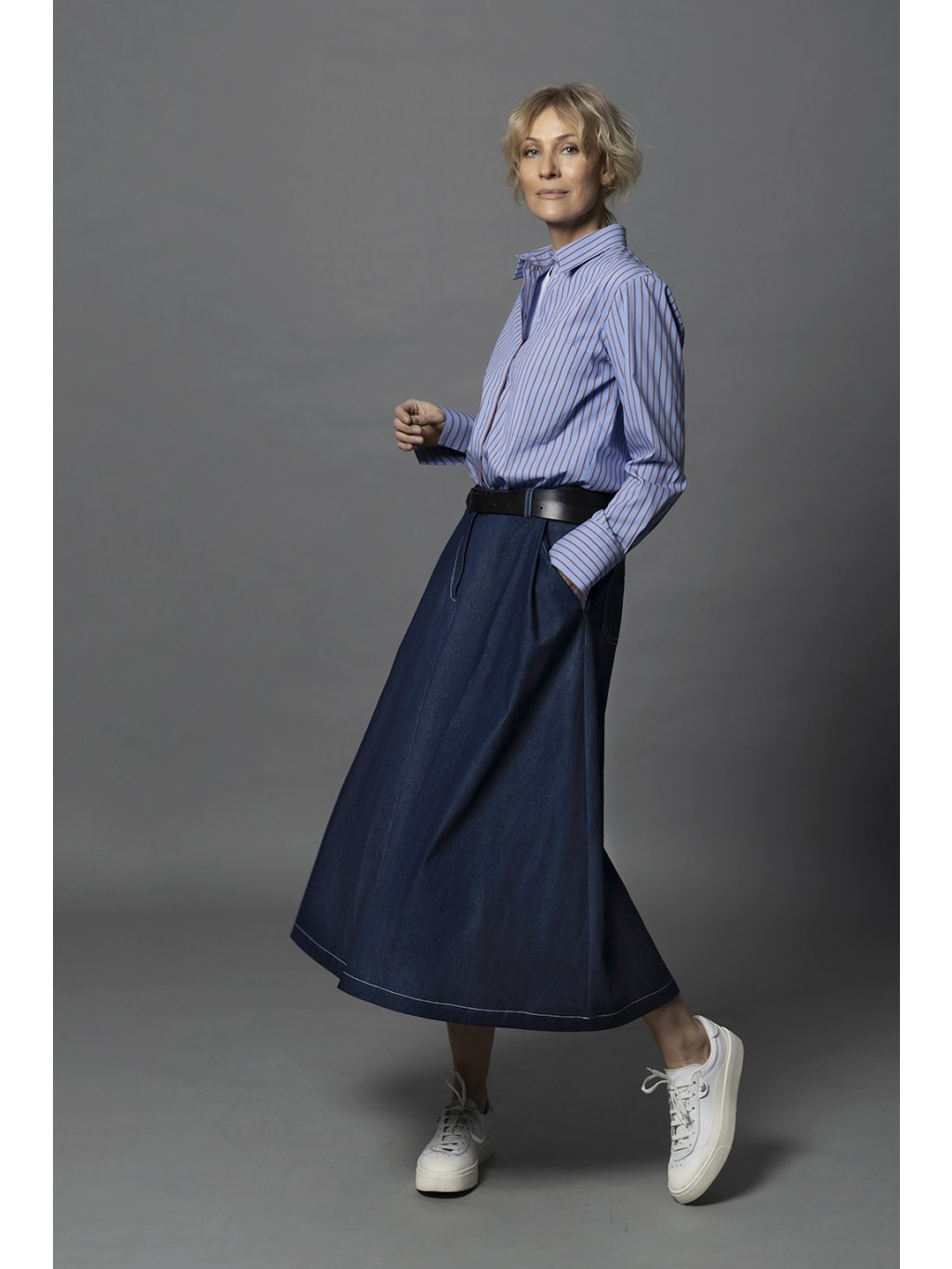 Áčková sukně má měkké sklady v pase, poklopec v předním středu a poutka na kožený pásek.