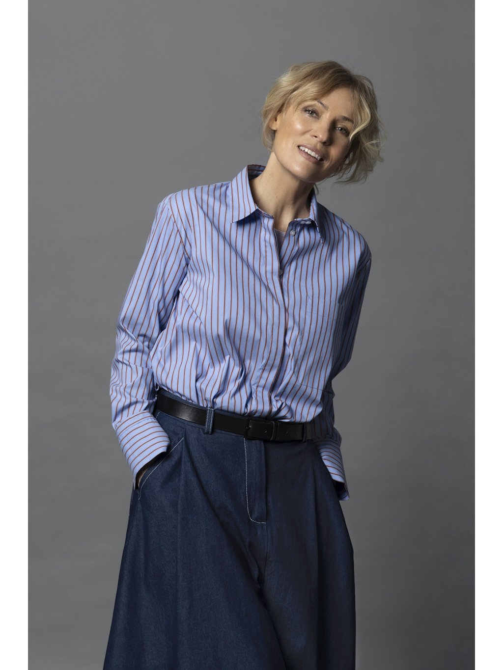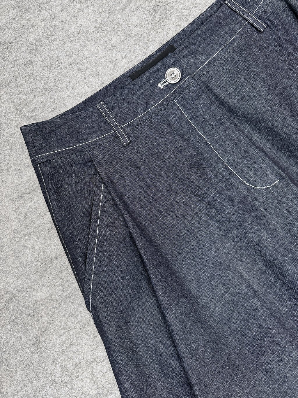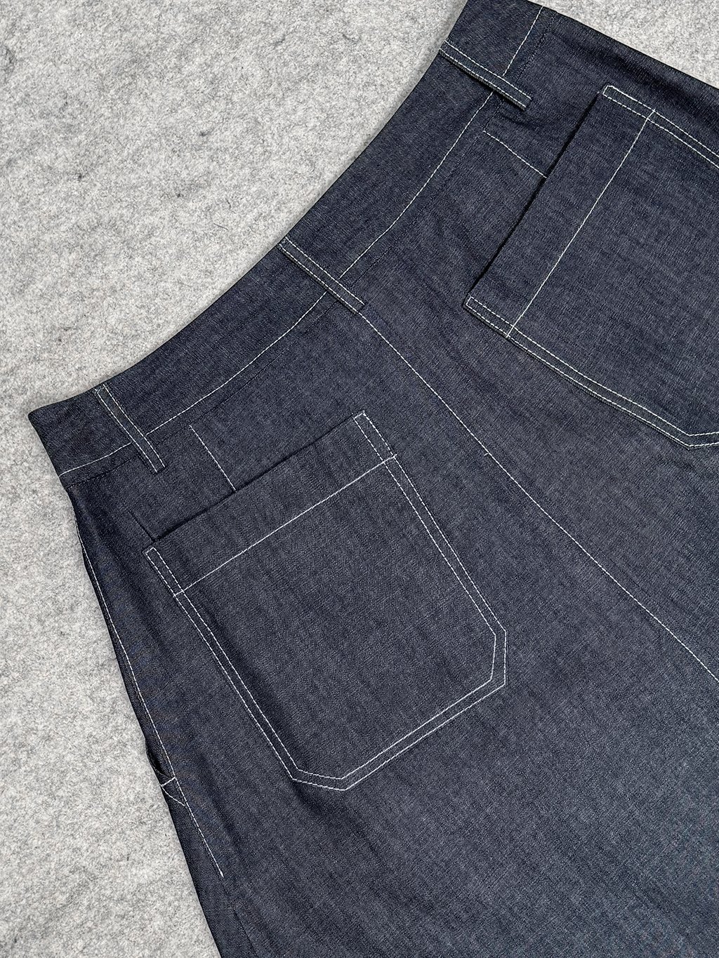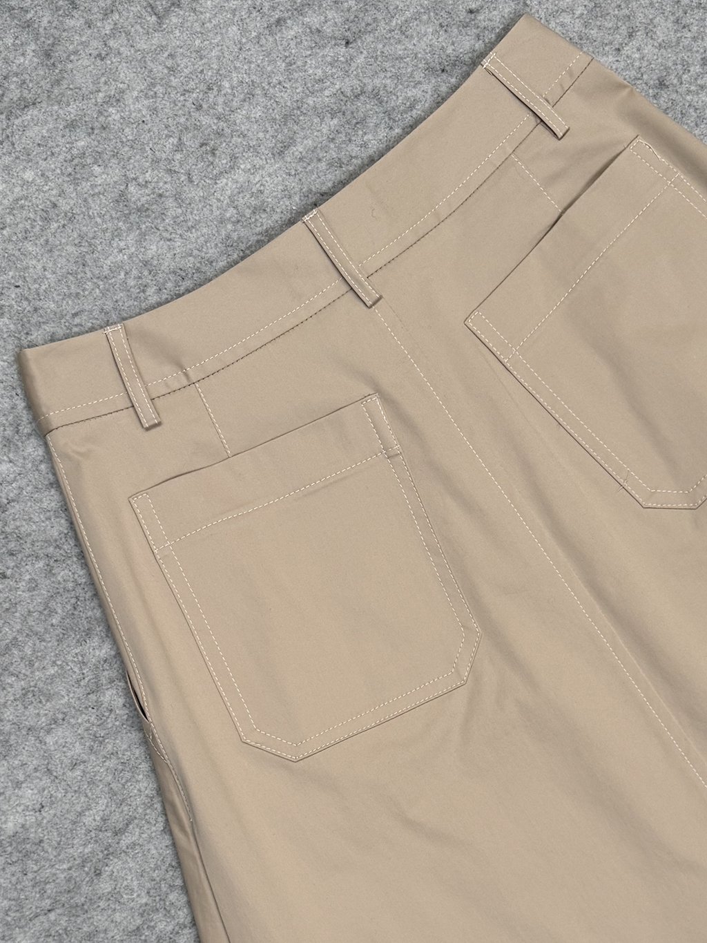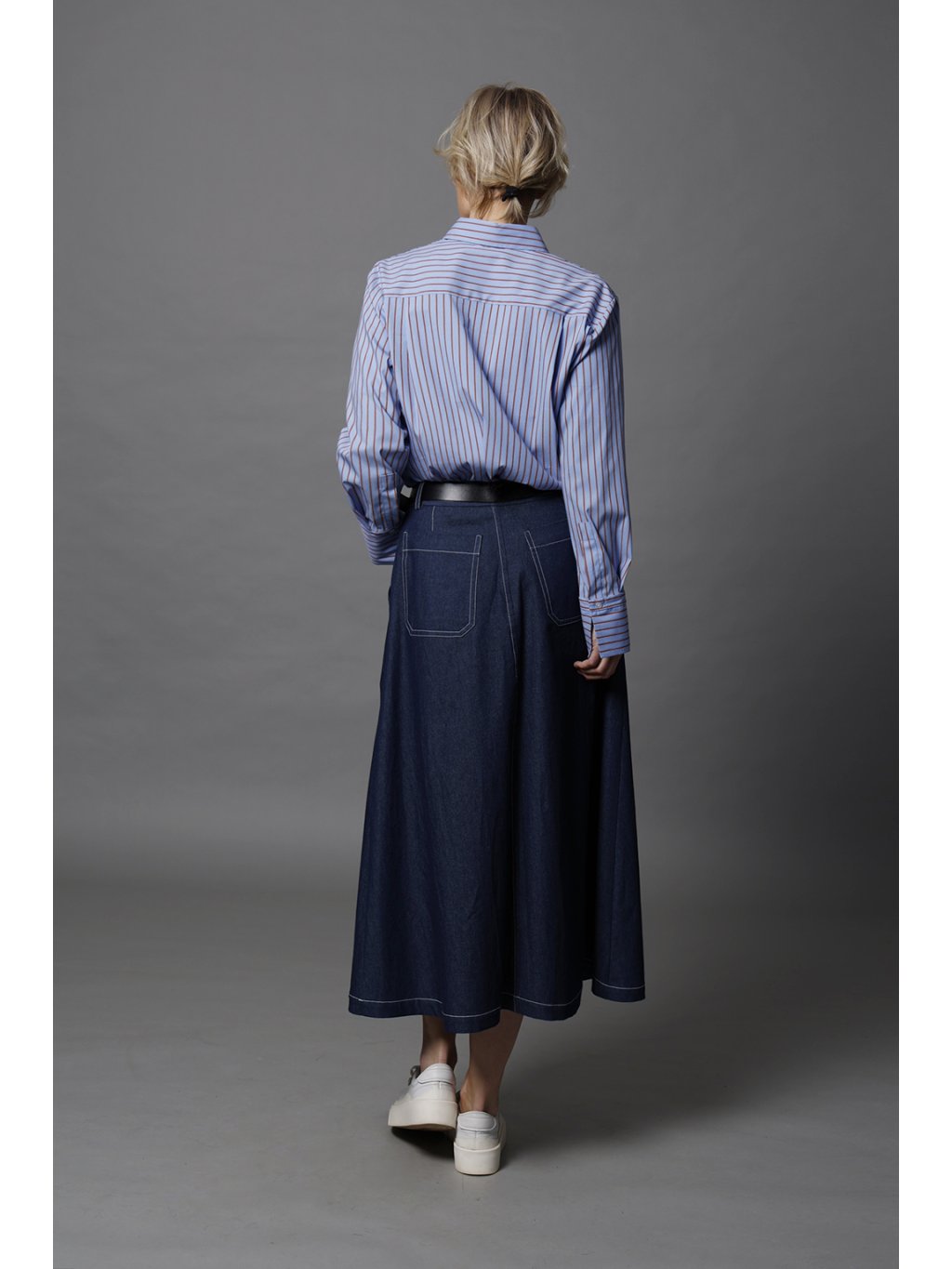 Áčková sukně má měkké sklady v pase, poklopec v předním středu a poutka na kožený pásek.
