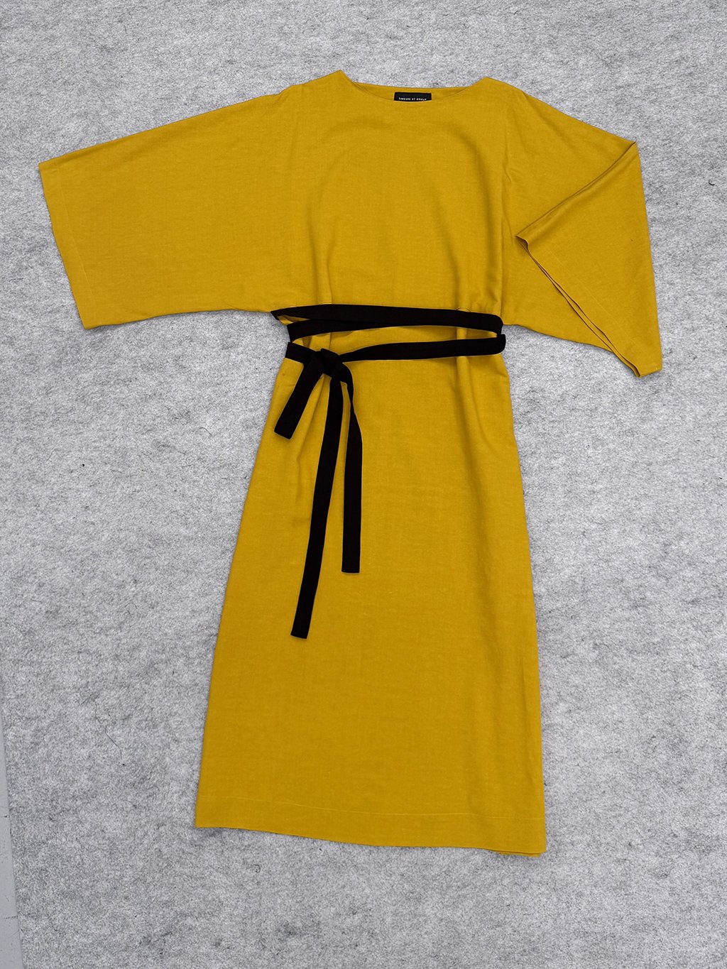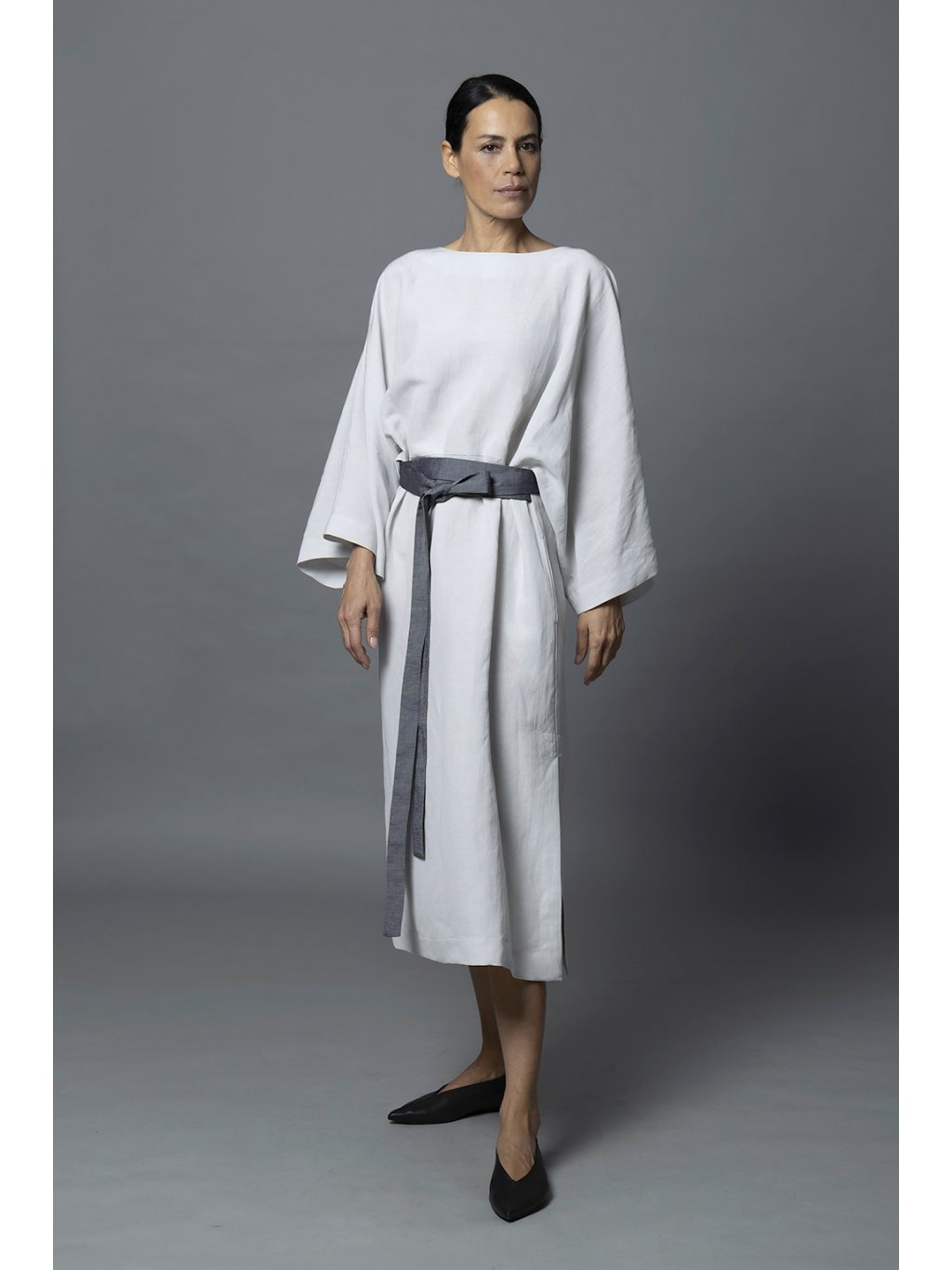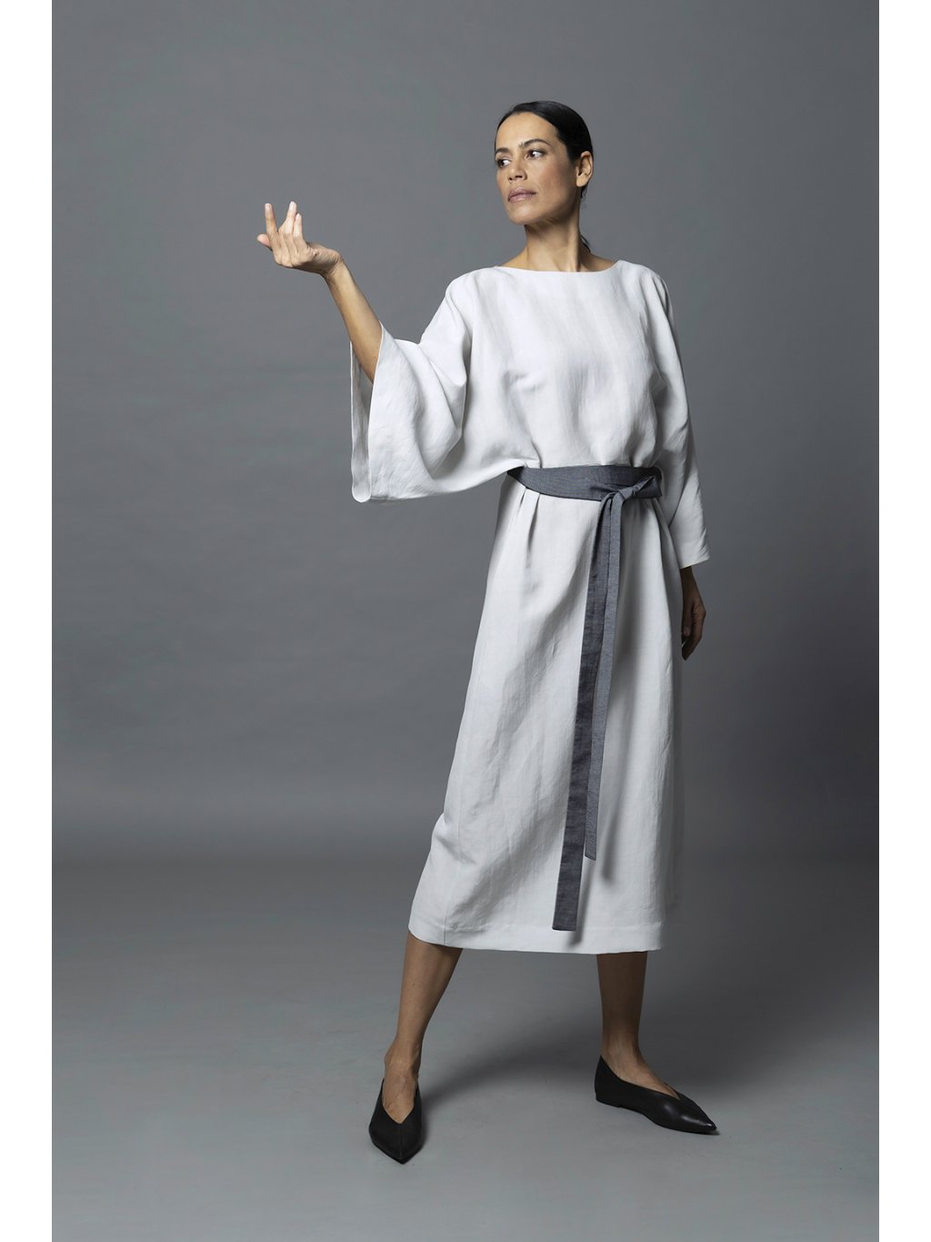 Šaty inspirované japonským minimalismem jsou ve tvaru T s širokým rukávem a lodičkovým výstřihem. V pase přepásané vázačkou.