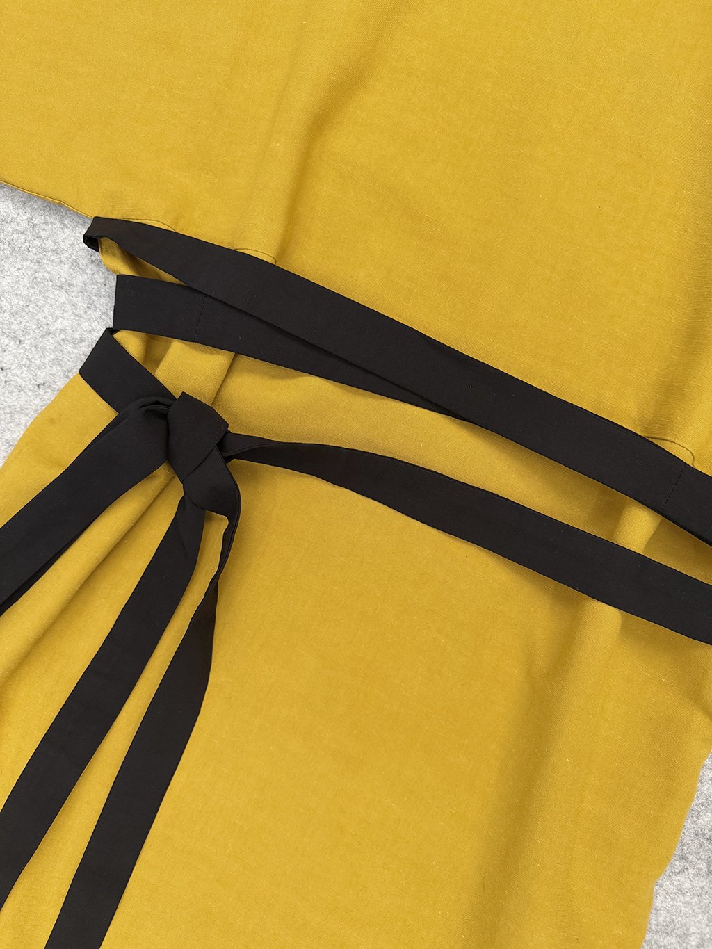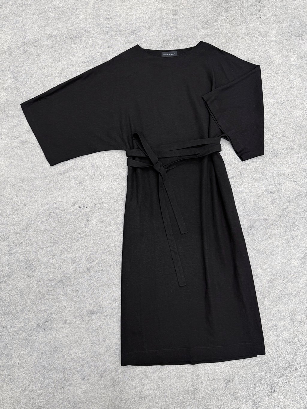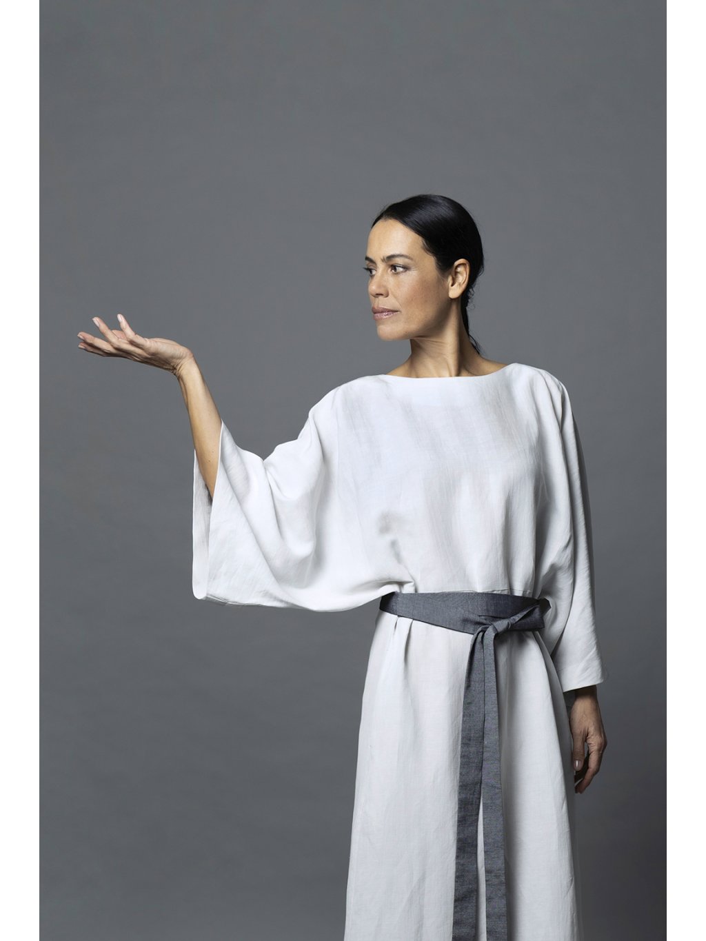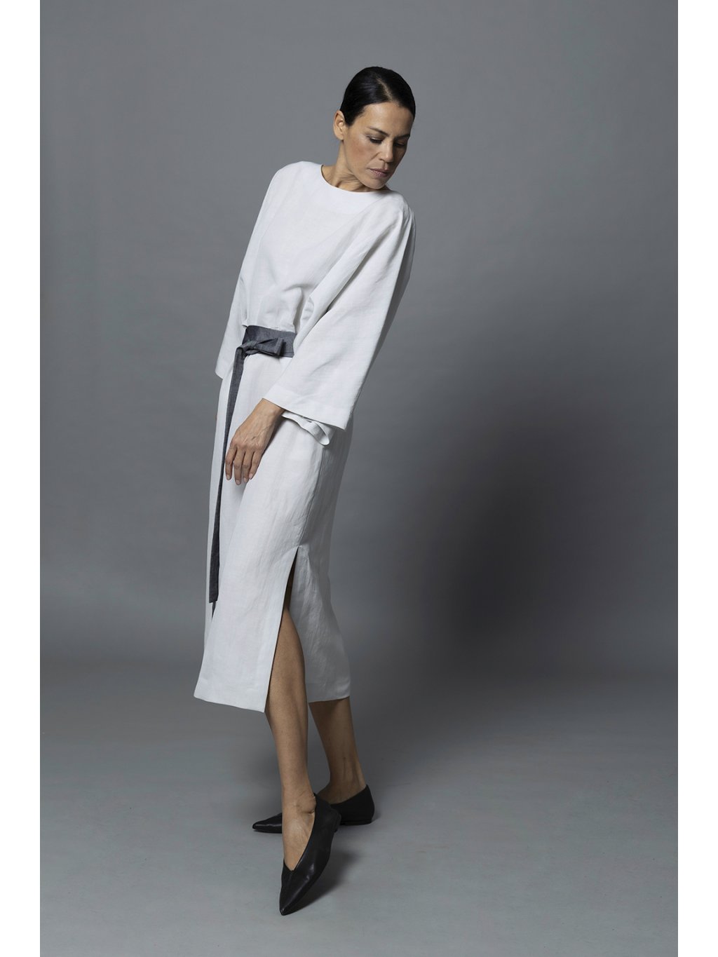 Šaty inspirované japonským minimalismem jsou ve tvaru T s širokým rukávem a lodičkovým výstřihem. V pase přepásané vázačkou.