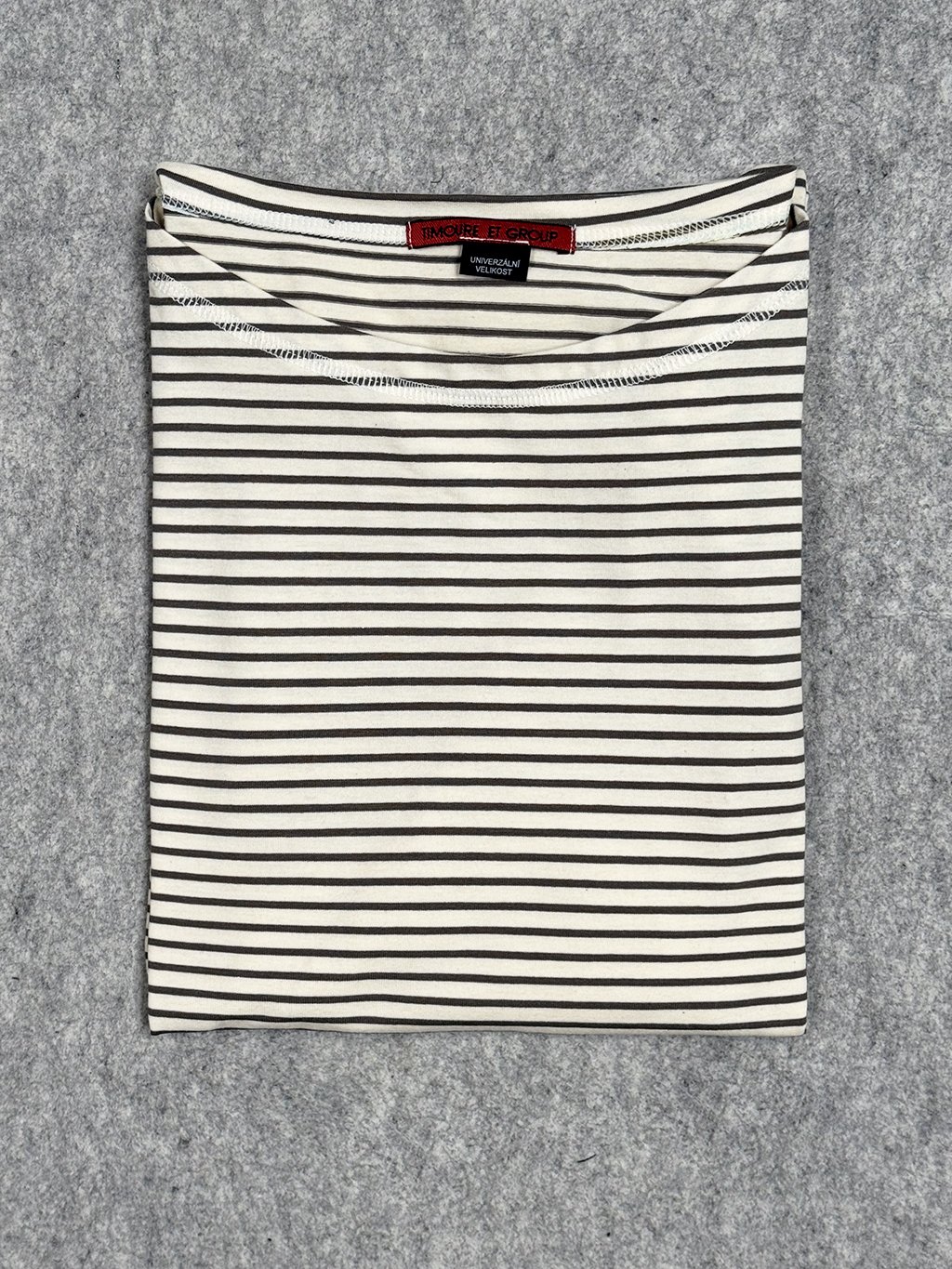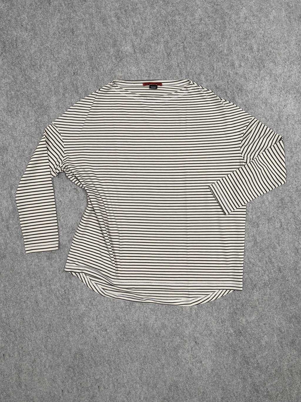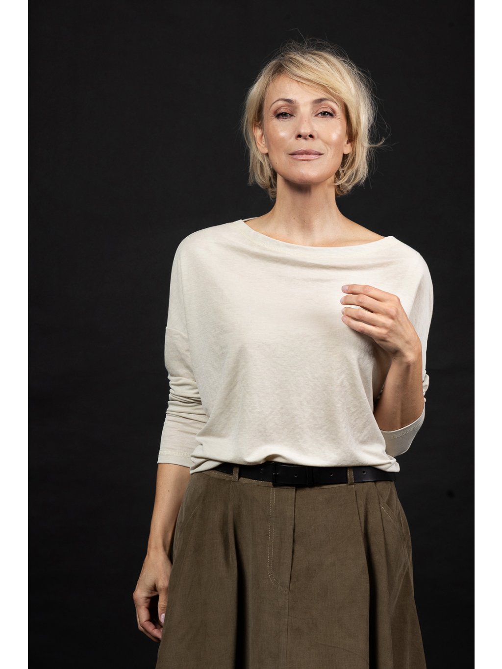 Triko s dlouhým rukávem a lodičkovým výstřihem má širší střih s lehce prodlouženým zadním dílem.