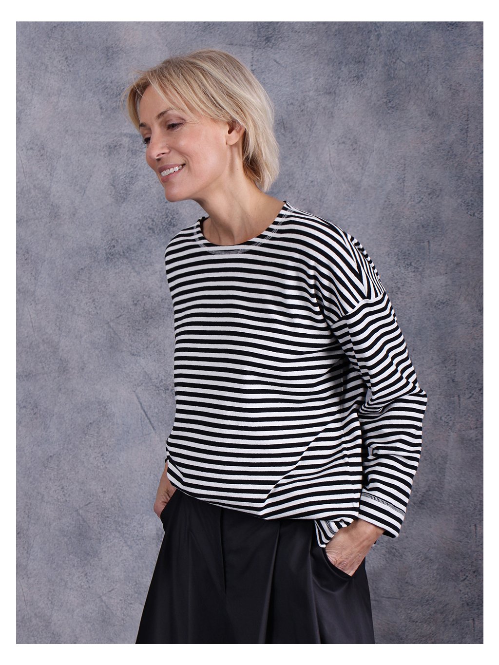 Zdánlivě klasické triko v nové proporci ve tvaru krabičky s kulatým výstřihem.