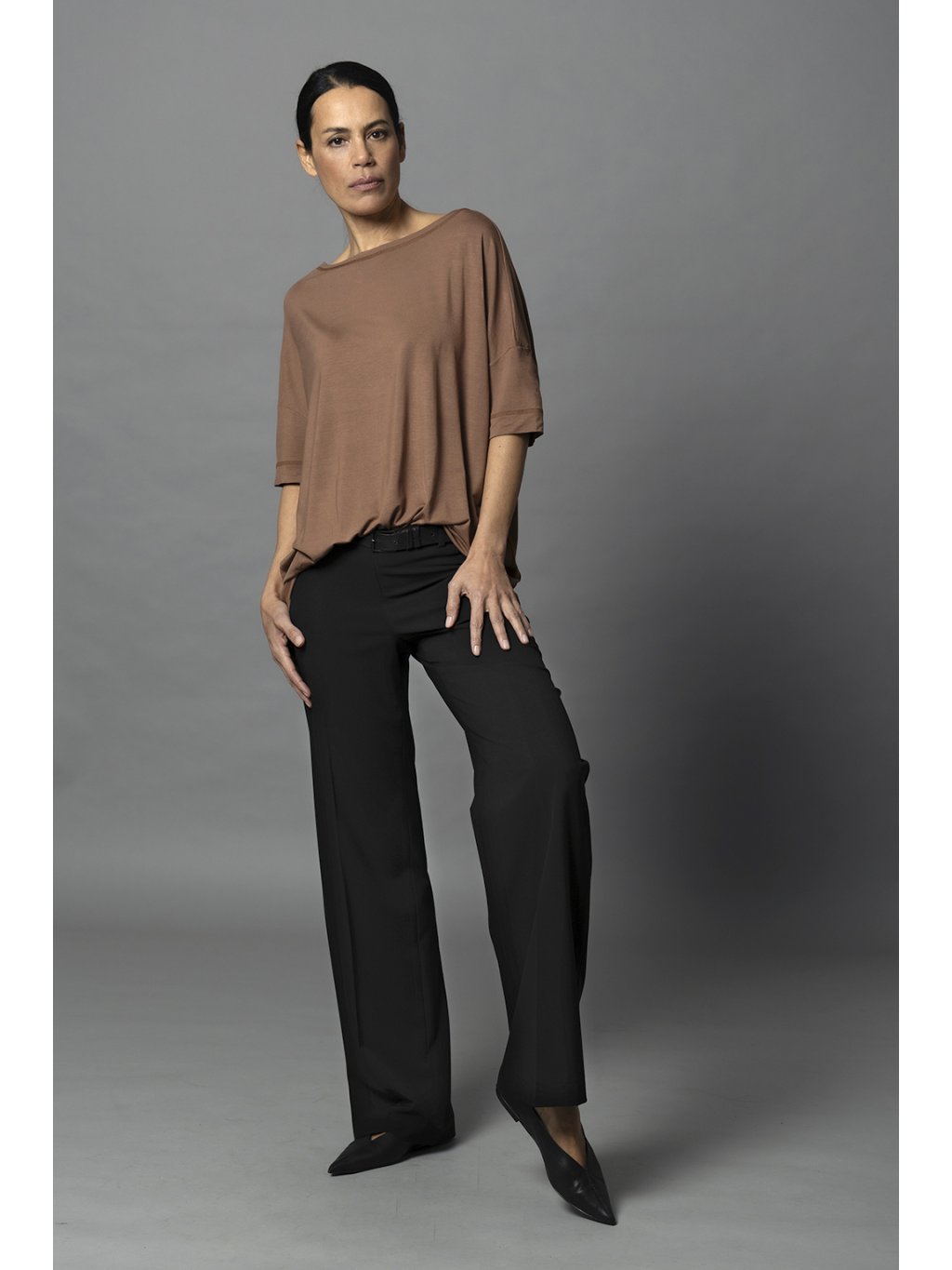 Širší hladké kalhoty s rovnou nohavicí skvěle sedí a prodlužují nohy.
